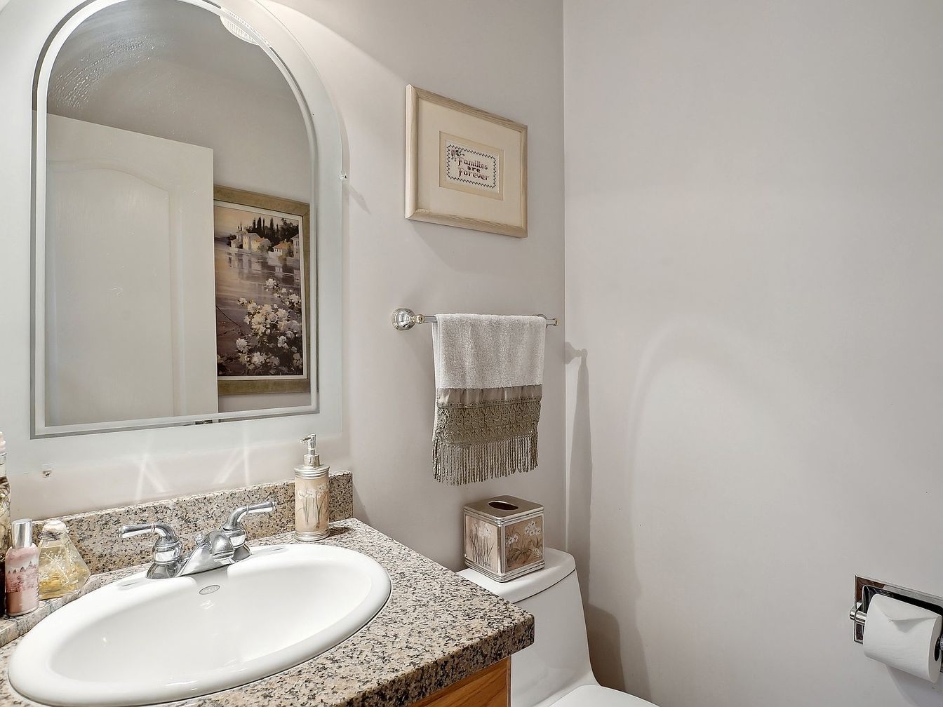 This powder room features a compact and efficient layout with a soft, neutral color palette dominated by pristine white and subtle beige tones. A granite countertop with speckled patterns offers a stylish yet durable surface, complementing the white oval sink and polished chrome faucet. Above the sink is a large arched mirror framed in a simple white trim, contributing to the room’s clean and airy feel. Decorative touches include a framed “Families Are Forever” artwork and coordinated accessories such as a stylish tissue box and a towel with an intricate fringed pattern, enhancing warmth and personality in this small space.