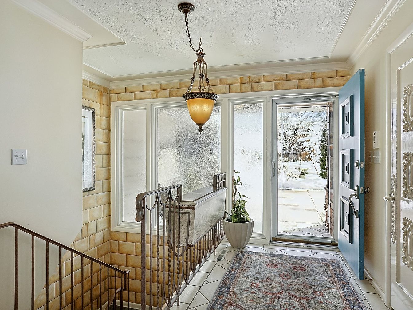 This inviting entryway features a combination of warm beige tiles on the walls and a light tiled floor with a classic patterned area rug, contributing to an elegant yet cozy atmosphere. The blue front door with modern geometric paneling contrasts beautifully against the neutral tones. A decorative iron stair railing leads downward, balancing functionality with a vintage touch. Above, an ornate pendant light with bronze and amber elements creates a warm glow. Frosted glass panels beside the door allow diffuse natural light while maintaining privacy. A potted plant adds a fresh, organic accent near the threshold.