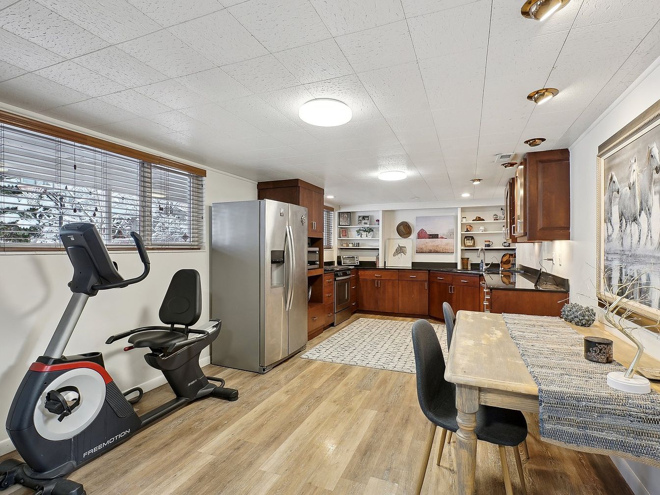 This space combines a functional kitchen with a small fitness area, showcasing a practical and multi-purpose layout. The kitchen features rich, dark wood cabinetry with sleek black countertops, arranged in an L-shape for efficient workspace. A large stainless steel refrigerator and oven offer modern appliances, flanked by windows with horizontal blinds that allow natural light to fill the room. Light wood-toned vinyl flooring adds warmth and contrasts nicely with the cabinetry. Nearby, a recumbent exercise bike brings an element of health-conscious living. A rustic wooden dining table with dark cushioned chairs anchors one side, complemented by artwork and decorative accents that introduce subtle country charm.