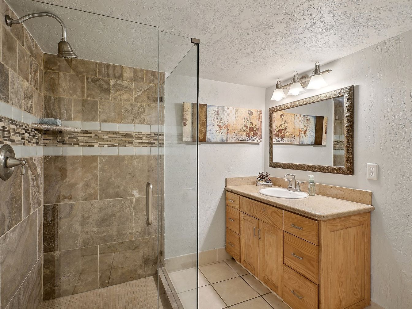 This bathroom features a modern and earthy design with a blend of natural tones. The walk-in shower is enclosed with a clear glass panel, showcasing large stone tiles in beige and brown hues, accented by a mosaic tile strip for visual interest. The floor inside the shower has smaller tiles for safety. Opposite the shower, the vanity has a light wood finish with multiple drawers and cabinets offering ample storage. A beige stone countertop holds a white sink, complemented by a decorative framed mirror and three brushed metal light fixtures above. The walls are textured white, enhancing the overall warm and inviting atmosphere.