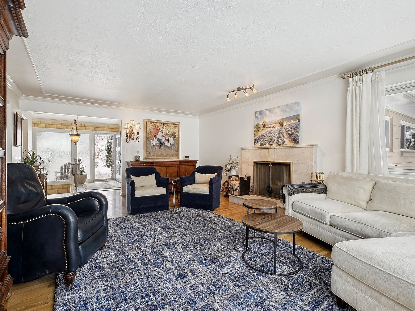 This inviting living room presents a balanced layout, centered around a traditional stone fireplace adorned with a serene landscape painting above. A large, textured blue and white rug anchors the seating zone, complementing a neutral-toned sectional sofa with scalloped edges and plush cushions. Opposite the sofa, two deep blue upholstered armchairs with light accent pillows provide contrast and additional seating, paired with dual round wooden coffee tables featuring black metal bases. A black leather armchair with nailhead details adds a classic, timeless element. The room is brightened by white walls and ceiling, enhanced by soft indirect lighting fixtures including wall sconces and a ceiling track light. A wide window with white curtains invites natural light, while the hardwood floors add warmth and cohesion throughout the space.