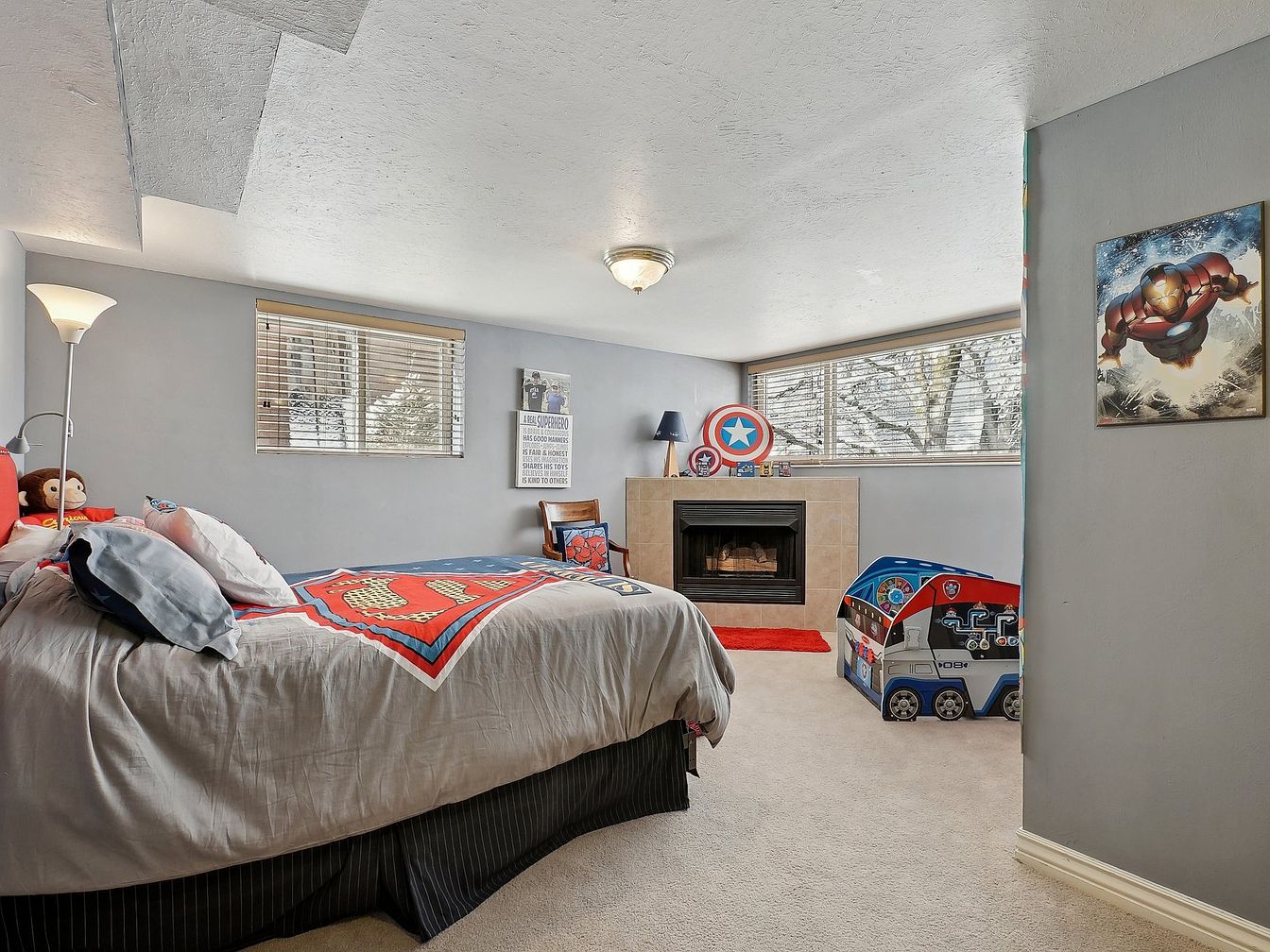 This cozy bedroom designed for a child features cool gray walls and a neutral beige carpet that balance playful superhero-themed décor. A twin bed is adorned with a vibrant Superman blanket and plush toys, creating a fun and inviting sleeping space. Two horizontal windows with blinds allow natural light while maintaining privacy. A compact fireplace with beige tile surround anchors the room, topped with a table lamp and Captain America collectibles. A wooden chair is positioned on one side, while a colorful toy chest in the shape of a truck sits near the fireplace, enhancing the room’s cheerful and imaginative atmosphere.