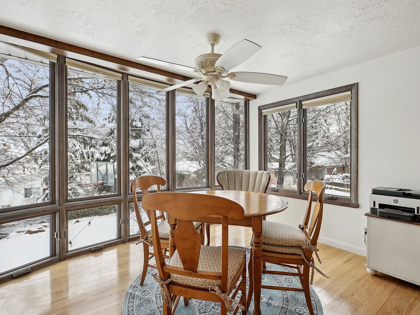 This cozy breakfast nook is framed by expansive, floor-to-ceiling windows that flood the space with natural light, offering a picturesque view of a snowy landscape outside. The wooden window frames complement the warm honey tones of the hardwood floor. A round wooden table anchors the area, surrounded by four wooden chairs with patterned cushions tied securely to each seat. The space is softened by a circular area rug with subtle blue patterns beneath the table. A classic white ceiling fan with light fixtures adds functionality while maintaining the room’s traditional charm. A printer station subtly hints at the nook’s flexibility as a casual workspace.