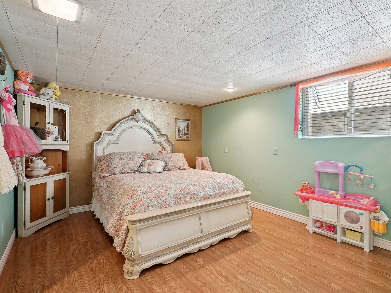 This intimate bedroom corner features a delicate vintage-inspired bed with ornate detailing and pastel floral bedding that sets a soft, inviting tone. The walls showcase a contrasting two-tone palette with a warm golden textured accent behind the bed and a calming light teal on the adjacent walls. The flooring is medium-toned wood laminate, adding warmth and coherence. A corner cabinet with a white and wood finish holds charming antique-style décor. A large window brings natural light, complemented by a pink sheer curtain, while children’s toys add a playful touch to the serene, homey space.