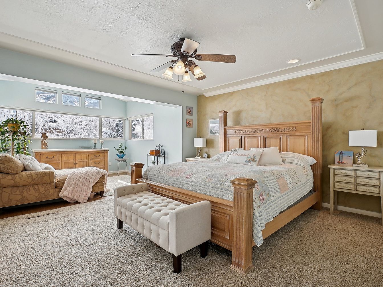 This master bedroom blends rustic charm with cozy comfort, highlighted by a large wooden bed with intricate carved posts and a soft patchwork quilt. Warm beige and earthy tones dominate the room, with a textured feature wall behind the bed adding depth. A plush carpet covers the floor, perfect for added warmth. Natural light floods the space through a series of expansive, corner windows that frame snowy outdoor views, complemented by light blue walls. A tufted bench at the foot of the bed, ornate wooden side tables, and a cozy chaise lounge offer relaxation and function. Ceiling fan lighting adds classic elegance above.