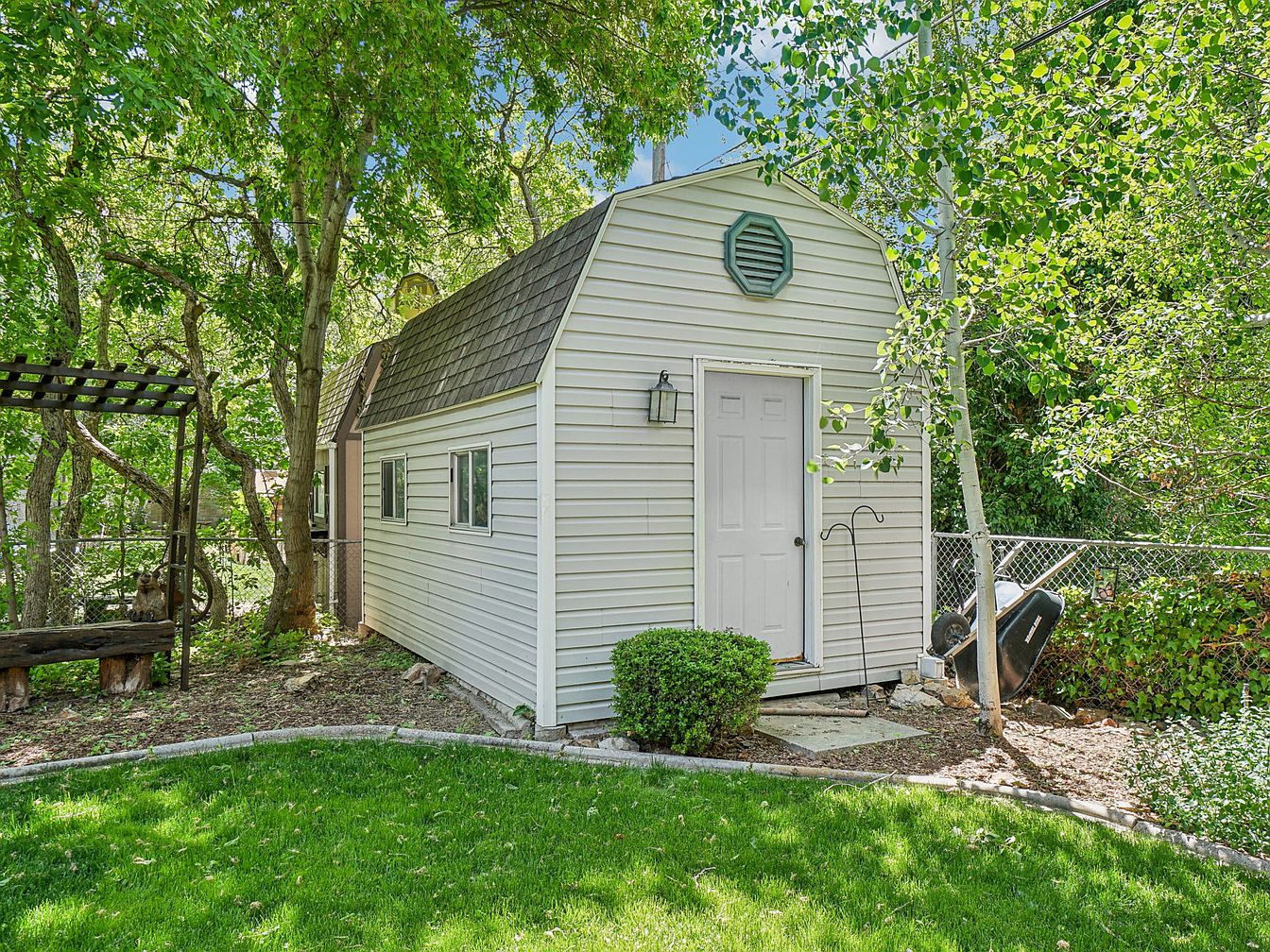 This quaint backyard storage shed features white vinyl siding with a gambrel-style roof topped in dark shingles, adding a rustic charm. A small octagonal vent painted green punctuates the front facade above a solid white door framed simply by trim. Around the shed, vibrant green grass and various trees provide a serene, shaded environment enhanced by dappled sunlight filtering through leaves. On one side, a sturdy wooden bench and trellis blend naturally into the garden ambiance, while a wheelbarrow leans casually near a chain-link fence covered in vine growth, offering practical outdoor utility within this peaceful, tidy space.