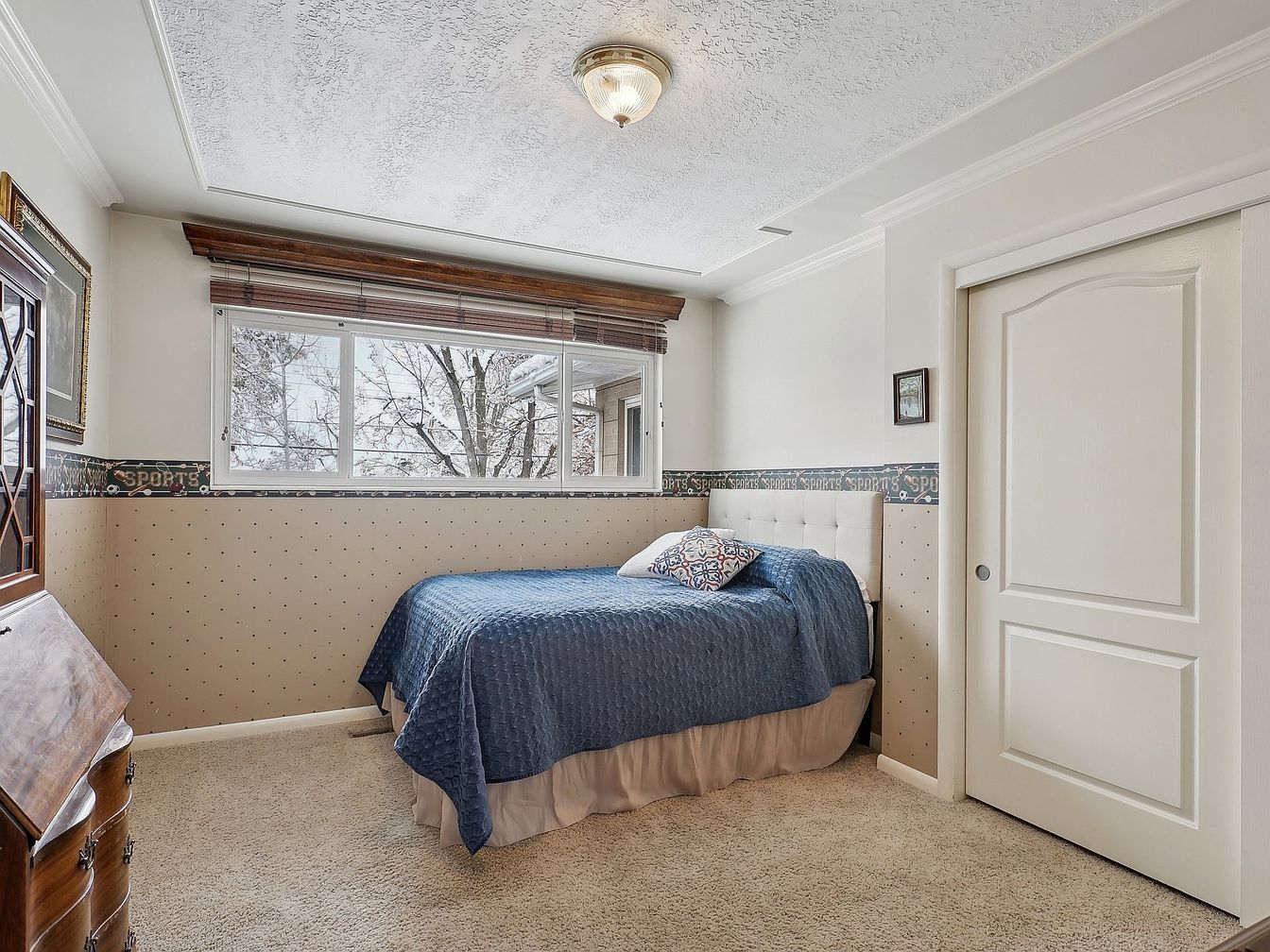 This bedroom features a compact layout with a twin bed positioned against the wall beneath a large window, allowing natural light to illuminate the space. The walls are painted in a two-tone style, with the lower half in a beige dotted pattern and a playful dark blue “SPORTS” border wrapping around the room, contrasting with the crisp white on the upper half and trim. The bed is dressed in a textured deep blue bedspread, complemented by patterned pillows. Neutral carpet flooring adds warmth, while wood trim above the window and a classic white sliding door complete the traditional yet inviting design.