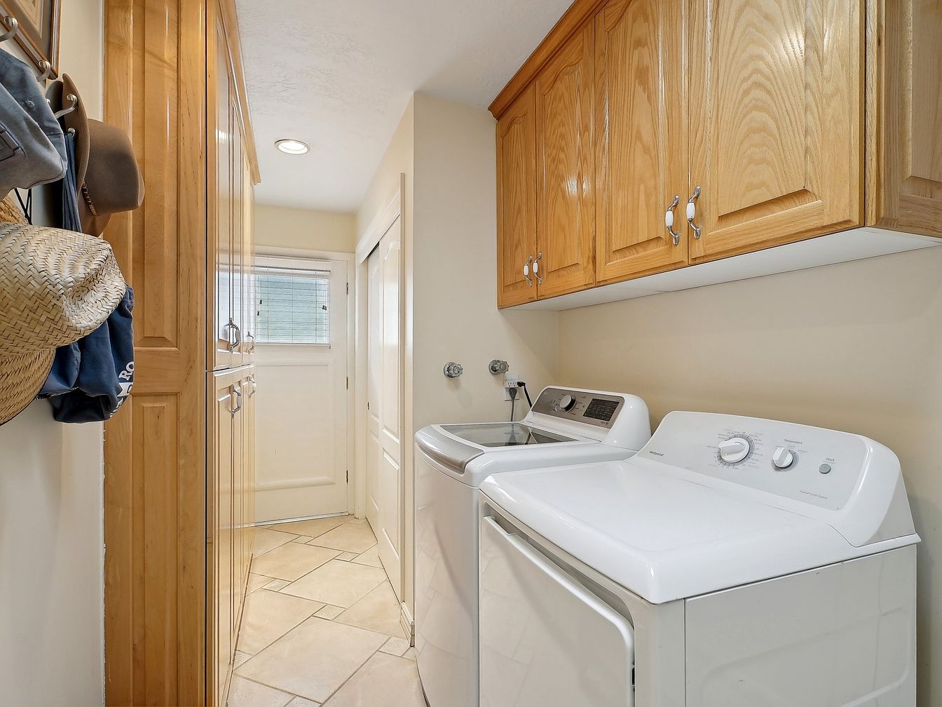 This laundry room features a narrow, efficient layout with off-white walls and cream-colored tile flooring set diagonally with decorative accents. On the right, a white washing machine and dryer sit side by side beneath a set of warm honey-toned wooden cabinets with simple silver handles, providing ample storage. Opposite these, tall wooden cabinetry runs along the left wall, offering organized space for laundry essentials. A small window above a white back door allows natural light into the space. A hat and bag hang on hooks near the entrance, adding a personal touch to this functional utility room.