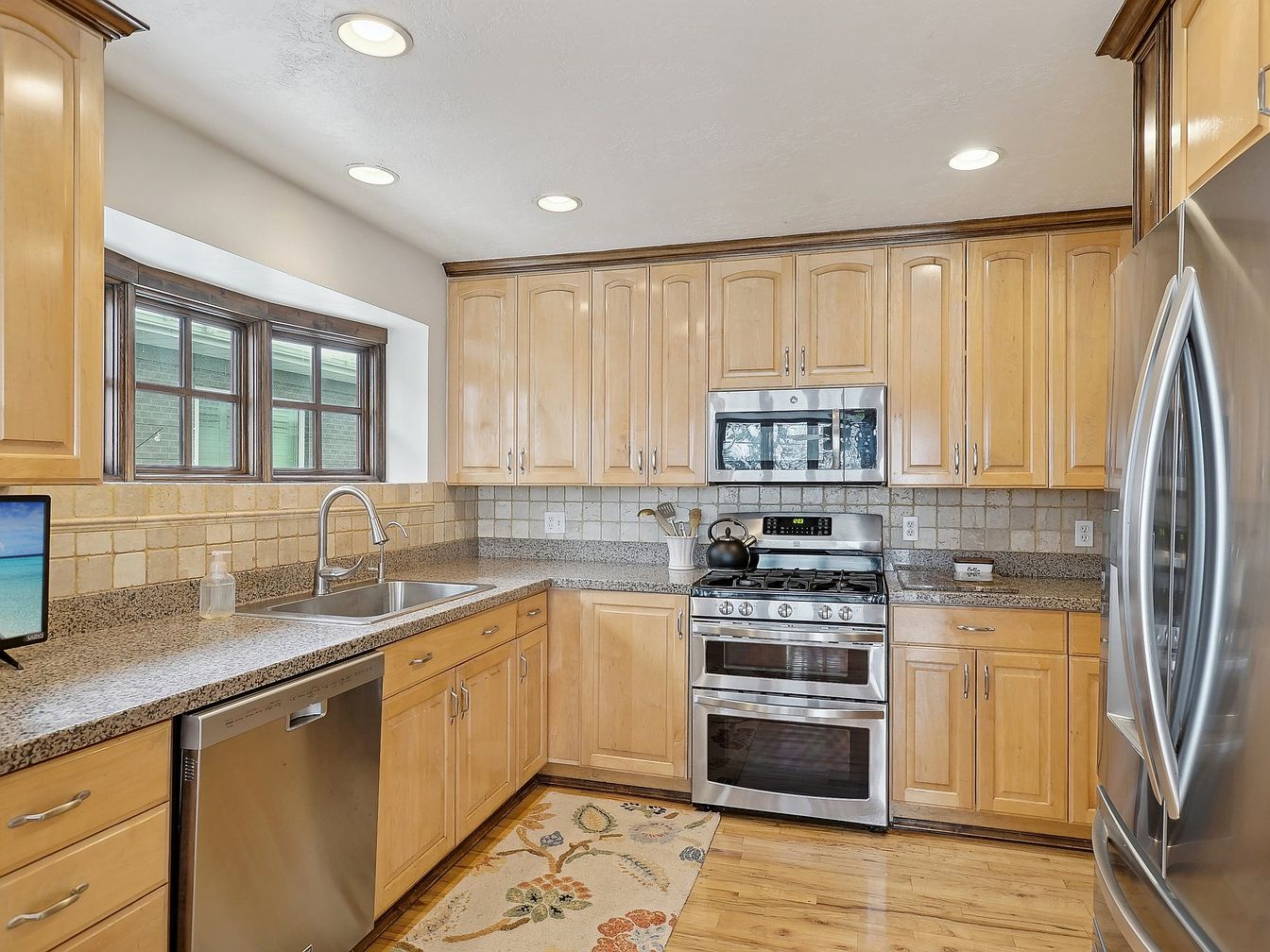 This kitchen features a U-shaped layout with light honey-colored wooden cabinets that extend to the ceiling, offering ample storage. The countertops are a speckled granite with earthy tones, complemented by a beige tile backsplash with a textured finish. Stainless steel appliances, including a double oven range, a dishwasher, and a French-door refrigerator, add modern convenience and contrast to the warm cabinetry. Above the sink, a wide window framed in dark wood provides natural light, while recessed ceiling lights brighten the space evenly. The hardwood floor and a floral-patterned rug add warmth and subtle color accents.