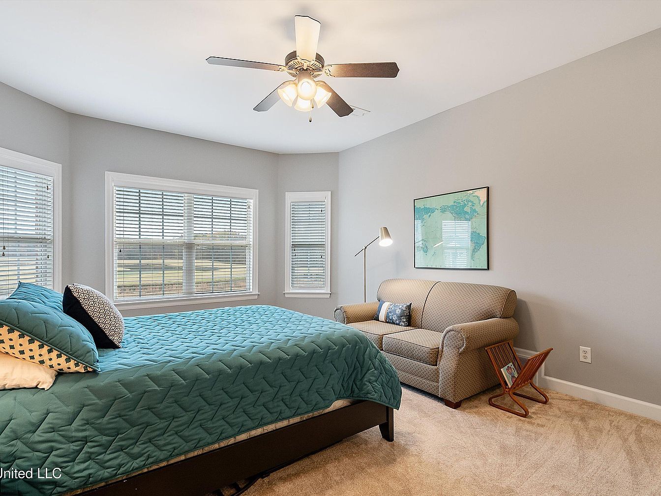 This cozy bedroom features a relaxed sitting area with a patterned loveseat positioned against a soft gray wall. A floor lamp with a slim metallic stand provides targeted lighting next to the couch. Above it, a framed world map adds a touch of travel-inspired decor. The bed is adorned with a textured teal quilt and multiple pillows with complementary patterns, creating a serene color palette. Three large windows with white blinds allow natural light to fill the space, enhancing the neutral tones and beige carpeting. A small wooden rack in the corner adds subtle warmth to the tranquil setting.
