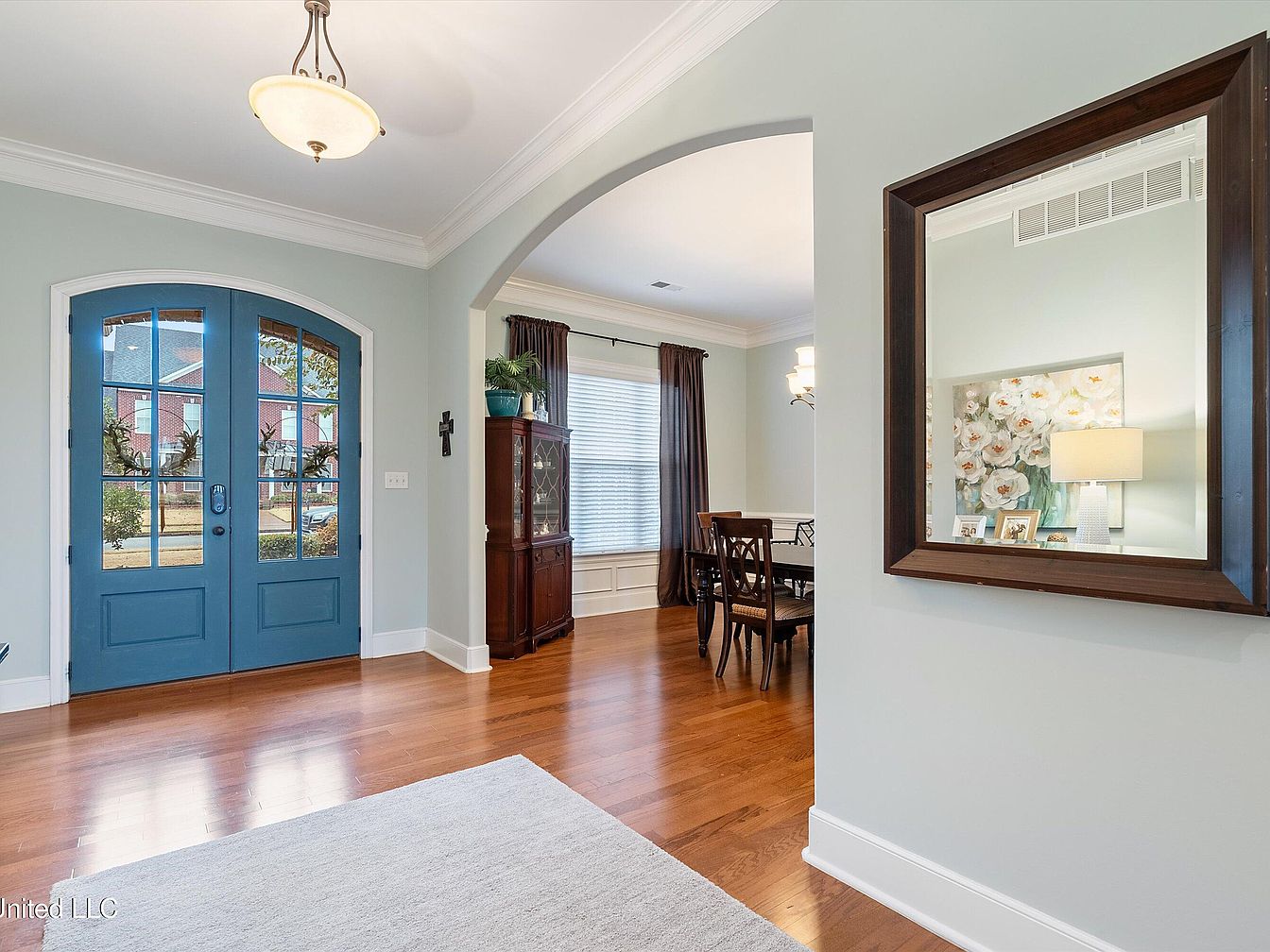 This welcoming entryway features warm hardwood floors that extend seamlessly into the adjacent dining area. The front doors are a striking blue with glass panels, allowing natural light to brighten the space. Soft gray walls create a calm backdrop, complemented by white crown molding and baseboards that add architectural interest. The arched doorway subtly separates the entry from the dining room, which is furnished with a traditional dark wood china cabinet and matching dining set. Floor-length dark curtains frame a large window, enhancing the cozy, elegant atmosphere. A large wooden-framed mirror reflects light and décor, adding depth to the space.