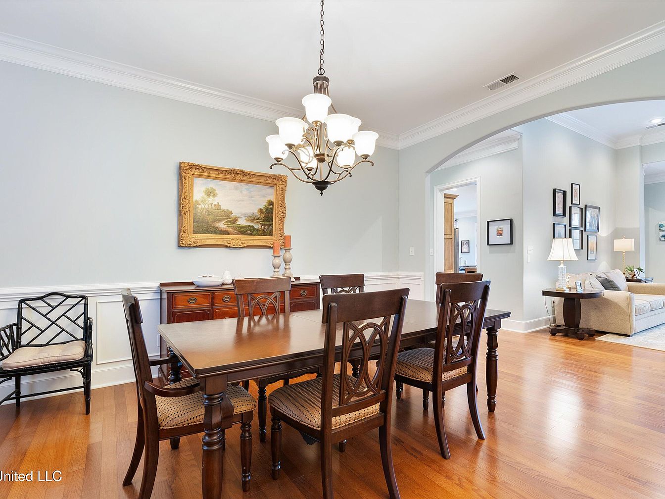 This dining room features a classic design with warm hardwood flooring that complements the rich, dark wood dining table and matching chairs creating an inviting atmosphere. The chairs have patterned upholstery adding subtle texture while the table’s turned legs showcase traditional craftsmanship. Walls painted in a soft, neutral tone highlight the white wainscoting and crown molding, enhancing architectural interest. A golden-framed landscape painting adds a touch of elegance above the mahogany buffet, which displays decorative candlesticks. The ornate chandelier hanging centrally provides soft light and a sense of refined style, while an archway opens to a bright living area indicating open-plan flow.
