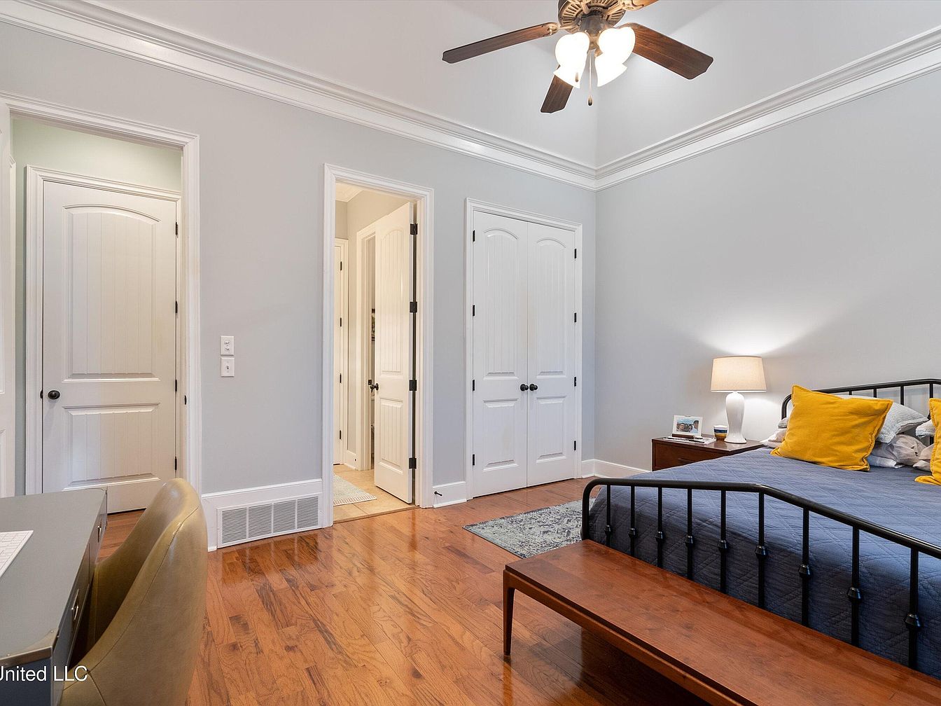 This bedroom offers a serene and inviting atmosphere with soft gray walls contrasted by rich honey-toned hardwood flooring. A black metal bed frame is dressed in a muted blue quilt, accented by bright mustard yellow pillows that inject a cheerful pop of color. To the right, a wooden bench adds warmth and practical seating at the foot of the bed. Classic white crown molding and trim elevate the space, while multiple white paneled doors suggest ample closet and bathroom access. A ceiling fan with a bronze finish and soft lighting from a bedside lamp complete this comfortable retreat.