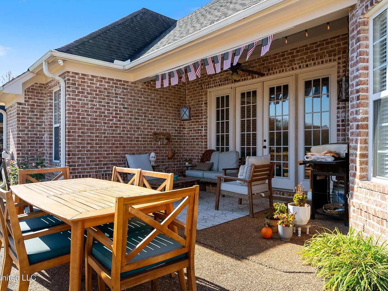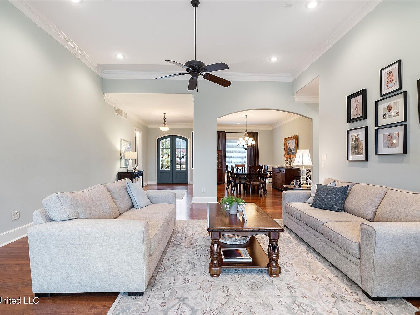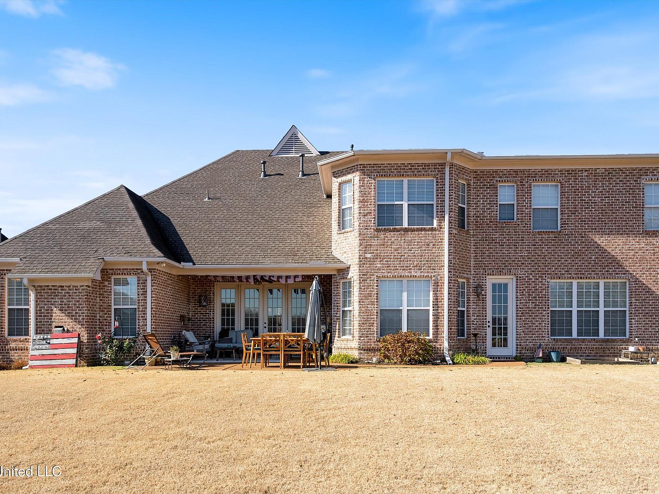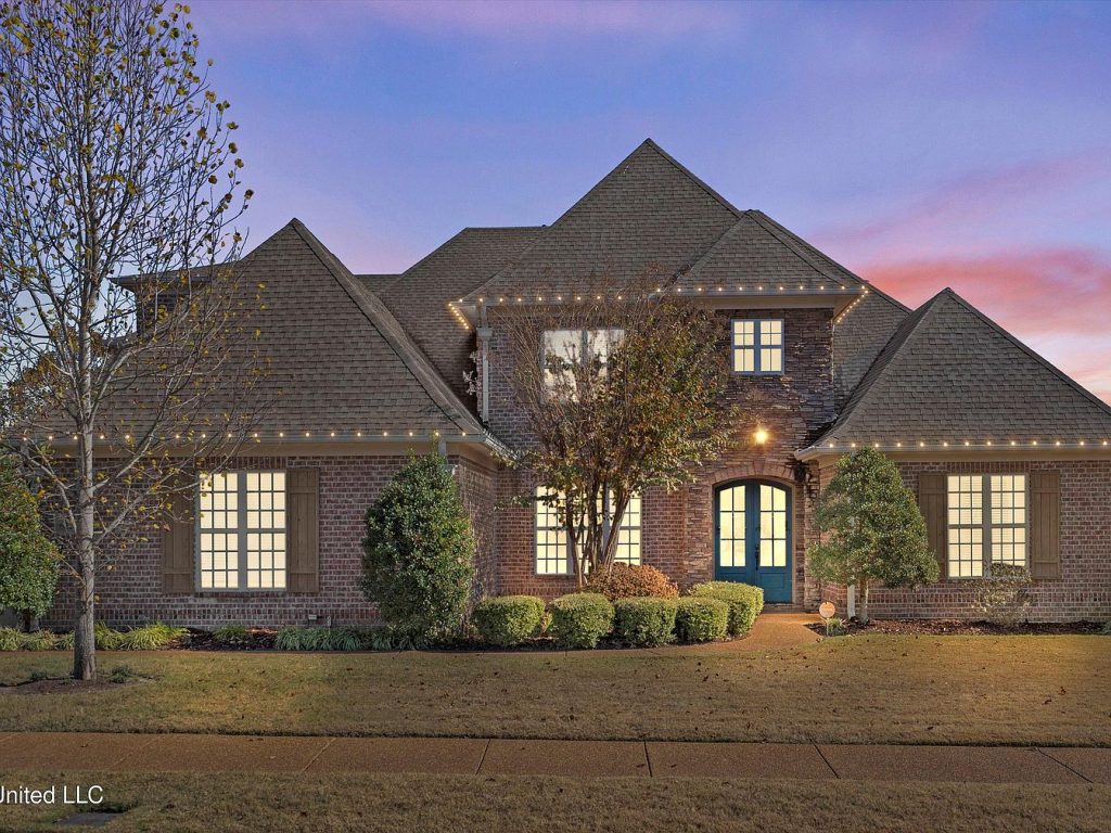 This exquisite home in Olive Branch, MS, showcases a traditional architectural style marked by its steeply pitched rooflines and brick exterior with stone accents surrounding the entrance. Built with spaciousness and comfort in mind, this residence offers an impressive 4,883 square feet of living space featuring 6 bedrooms and 5 bathrooms, ideal for large families or entertaining guests. Inside, grand 14-foot ceilings enhance the open and elegant atmosphere in the main living areas. The home includes two sizable living rooms, a formal dining area perfect for hosting special occasions, and a chef’s kitchen equipped with custom cabinetry providing ample storage. Cozy fireplaces in both the living room and master bedroom add warmth and charm. The property is situated on a sizable plot that provides stunning golf course views overlooking an entire hole, creating a peaceful and picturesque backyard setting for relaxing or outdoor activities such as BBQs. Recent updates and renovations are not specifically mentioned, but the home’s condition and features speak to a well-maintained luxury residence. Listed at $594,400, this beautiful home invites you to experience the best views in Olive Branch, combining elegance, space, and scenic surroundings in a desirable location.