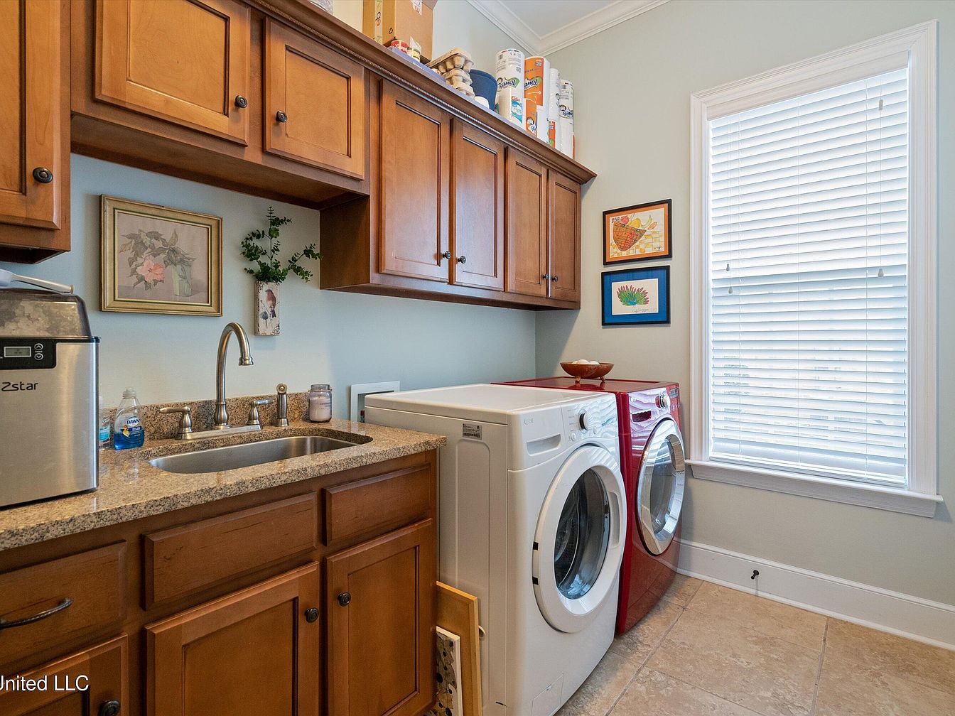 This laundry room is designed for both functionality and comfort, featuring warm-toned wooden cabinetry that offers ample storage above and below a polished granite countertop. The counter houses a stainless steel sink with a classic curved faucet, ideal for hand-washing delicate items. Two front-loading machines, a white washer next to a vibrant red dryer, stand side-by-side against a soft, neutral wall, contributing a striking pop of color. A large window with white blinds allows natural light to brighten the space. Decorative wall art and neatly arranged essentials on the cabinet tops add a touch of homely charm.