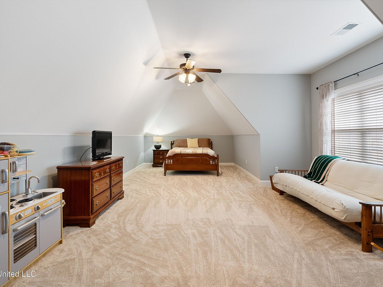 This loft bedroom features a vaulted ceiling with a central ceiling fan that adds a classic touch. The space is carpeted in a light beige tone, creating a warm, inviting atmosphere. A wooden bed with a footboard is positioned against the angled wall, accompanied by a matching nightstand with a small lamp. A vintage-style dresser supports a small television, while a play kitchen set adds a charming, playful element near the entrance. A simple futon with white fabric and exposed wooden frame sits by a large window adorned with white blinds and sheer curtains, allowing plenty of natural light.