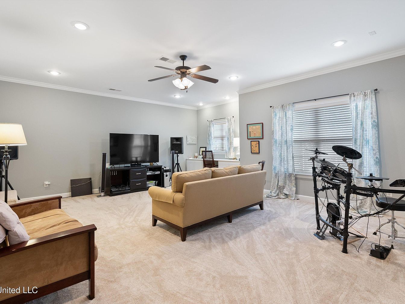 This spacious family room is designed for both relaxation and hobbies, featuring neutral beige carpeting that complements the soft gray walls. A comfortable tan sofa is centrally positioned to face a large flat-screen TV on a sleek black media stand, creating a cozy entertainment area. Natural light filters through large windows adorned with sheer floral curtains, enhancing the inviting atmosphere. A modern ceiling fan with lights hangs overhead, balancing function with style. To the side, an electronic drum kit adds a creative and musical touch, while a small desk and a pair of framed artworks indicate a multi-purpose living space. The overall decor is understated yet practical, blending comfort with personal interests.
