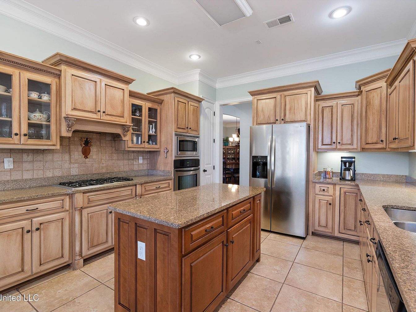 This kitchen features a warm, classic design with light wood cabinetry that extends to the ceiling, adorned with crown molding and intricate corbels above the stove. The cabinetry mix includes glass-front display cupboards showcasing elegant dishware, adding a decorative touch. A central island in a slightly darker wood tone contrasts beautifully with the lighter cabinets, topped with a polished granite surface that complements the similarly hued countertops throughout the kitchen. Stainless steel appliances, including a double-door refrigerator and built-in microwave and oven, provide a modern edge. The beige tiled backsplash and floor enhance the neutral, inviting color palette, while recessed ceiling lights ensure the space is well illuminated.