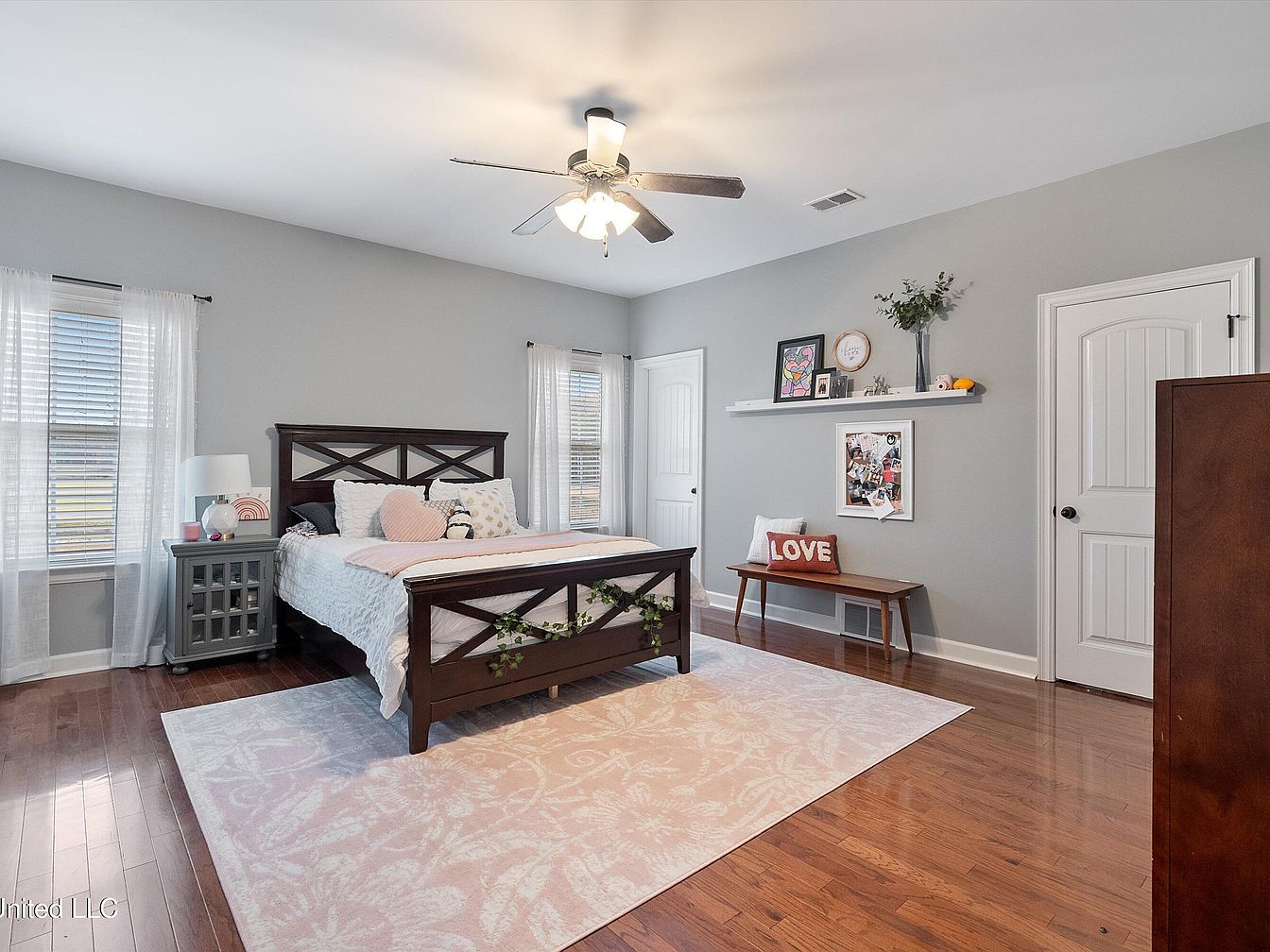 This spacious master bedroom blends soothing gray walls with rich hardwood floors, creating a warm yet modern atmosphere. A dark wooden bed frame with elegant cross design accents anchors the room, dressed in white bedding accented by soft pink and heart-shaped pillows, adding a touch of charm. Two large windows with sheer white curtains allow natural light to fill the space. A ceiling fan with lights hangs overhead, providing both illumination and circulation. On one wall, a floating shelf displays decorative items and framed art, complemented by a wooden bench beneath adorned with a “LOVE” cushion, balancing functionality and coziness.
