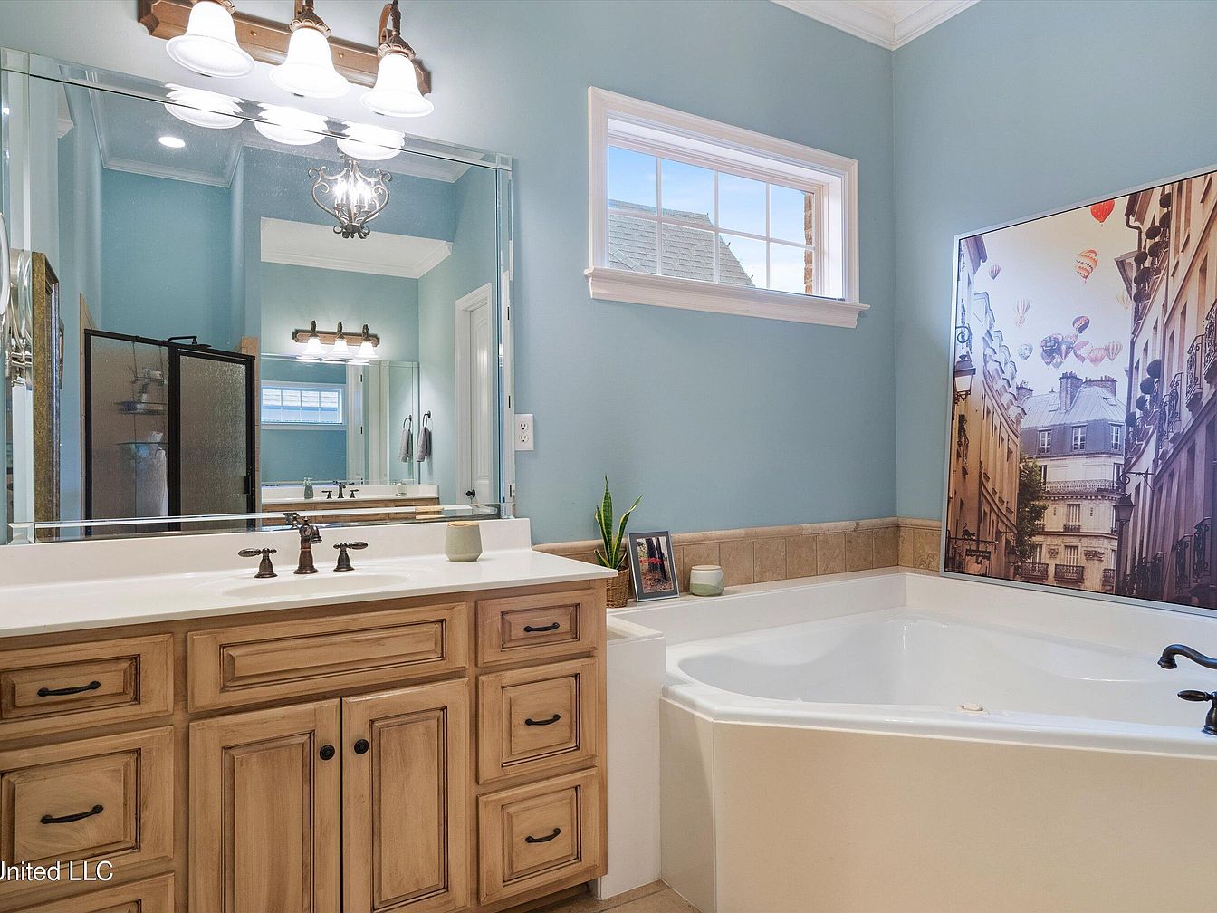 This serene bathroom features a large corner soaking tub with clean white surfaces, complemented by light beige tile surround. The walls are painted a soothing soft blue, creating a calm and refreshing atmosphere. A wooden vanity with a natural finish and dark hardware adds warmth and rustic charm, topped with a white countertop and classic bronze faucet fixtures. Above the vanity is a wide, framed mirror reflecting a separate shower area, and elegant traditional-style light fixtures provide ambient lighting. A small window above the tub offers natural light, while decorative items and a large artwork lend a personalized, inviting touch.