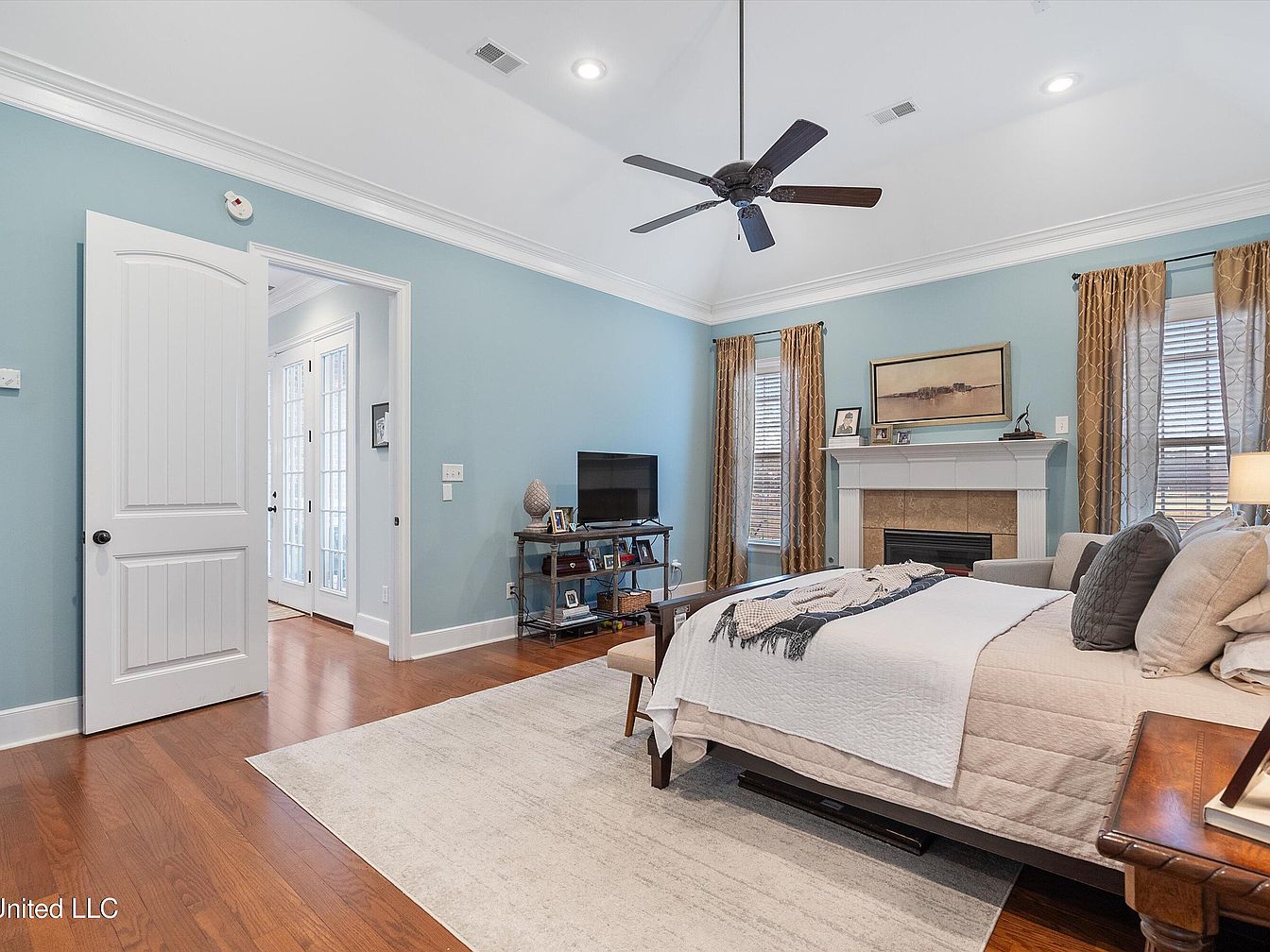 This spacious master bedroom features soothing light blue walls that contrast beautifully with warm wood flooring and white crown molding. A large area rug anchors the room, complementing the neutral bedding on the wooden bed frame. Twin windows are adorned with elegant gold-patterned curtains, framing a traditional white fireplace with a natural stone surround topped by a simple piece of art. The ceiling is vaulted, highlighting a dark wood ceiling fan that adds both functionality and charm. Opposite the bed, minimalist shelving holds a TV and decorative items, contributing to a cozy yet refined retreat ambiance.