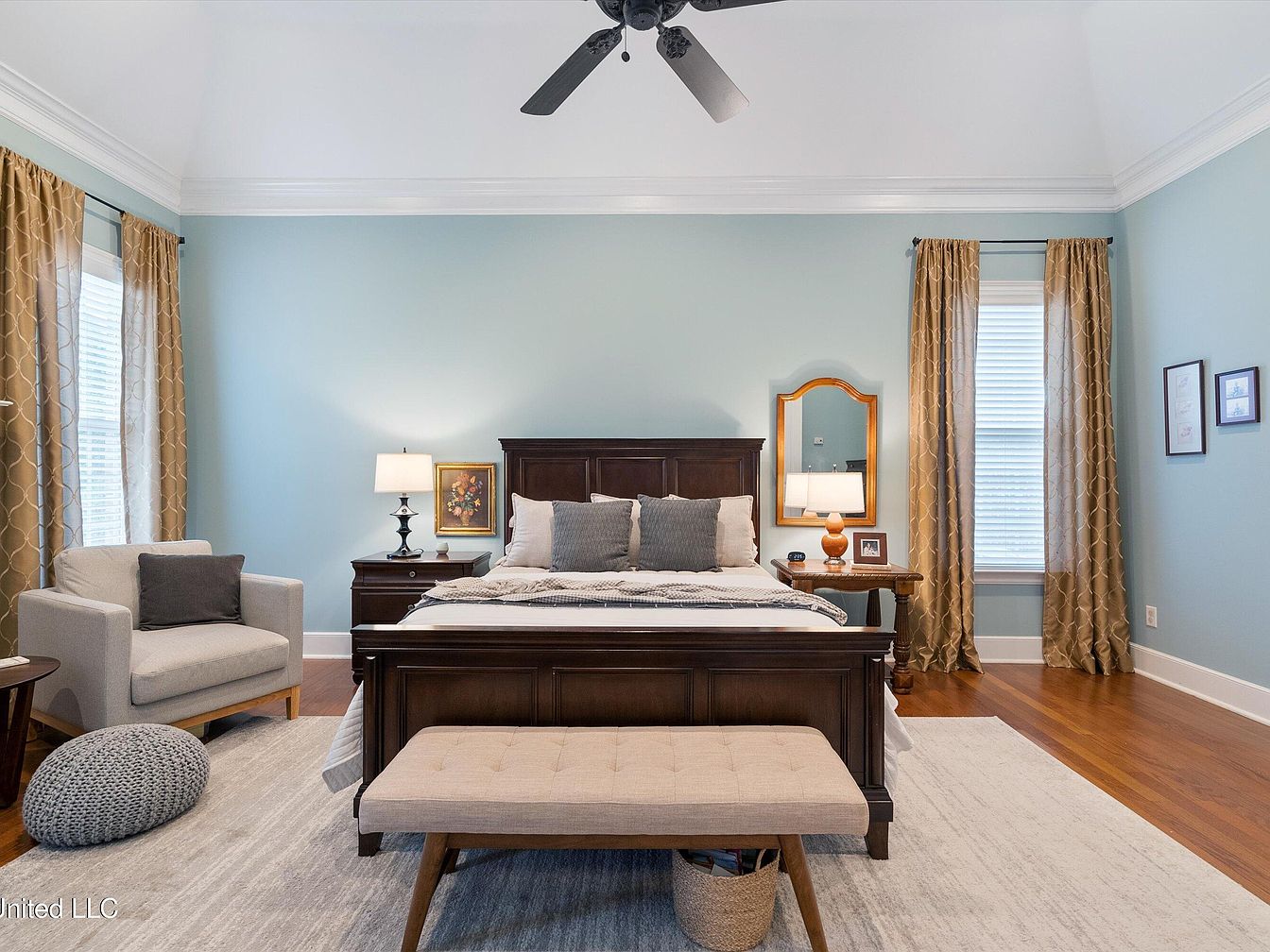 This master bedroom features a serene color palette with soft sky-blue walls complemented by warm honey-gold curtains framing tall windows, inviting natural light. The centerpiece is a dark wood bed with a high headboard, flanked by two matching nightstands holding elegant lamps, one of which pairs with a framed floral painting and the other with a classic mirror. A plush beige upholstered bench at the foot of the bed adds comfort and style, while a neutral-toned area rug anchors the space atop rich hardwood floors. The room’s vaulted white ceiling with crown molding enhances its openness, completed with a black ceiling fan for air circulation. A cozy beige armchair and textured pouf create a reading nook, rounding out the balanced and inviting design.