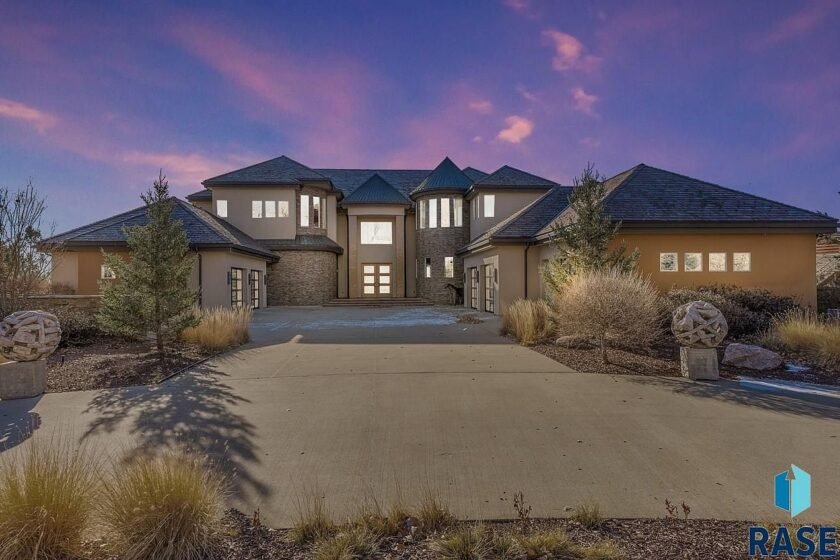 This avant-garde home in Dakota Dunes, SD, is a unique blend of luxury, quality construction, and innovative design, set on two lots with a heated driveway and water feature enhancing privacy. The striking architectural style features copper gutters and a slate roof, with southeast and west wings housing suites with full bathrooms. Inside, amenities include an outdoor kitchen, temperature-controlled wine room, cigar room, golf simulator, theater room, and an elevator leading to vaulted ceilings and terraces with water views. The master suite offers a private balcony, fireplace, and custom laundry conveyors. Listed at $6,000,000, this home exemplifies sophisticated living with unparalleled amenities.