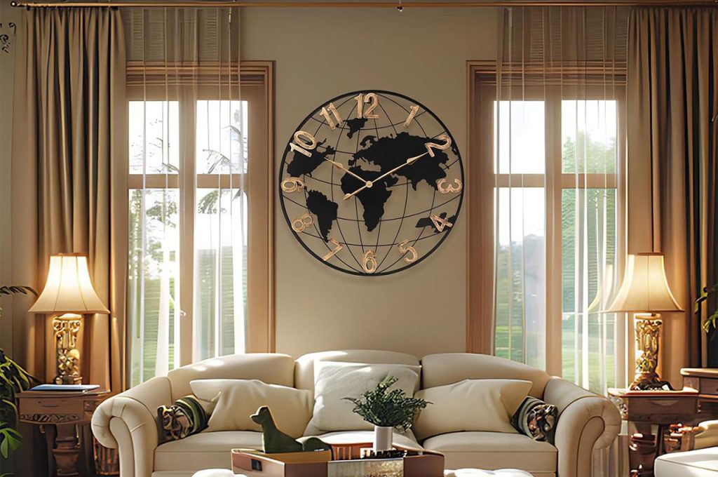 This large, 36-inch world map wall clock is a stunning piece that combines functionality with artistic elegance. Featuring geographical latitude and longitude lines as well as continental tectonic plates, it beautifully showcases Earth’s natural beauty through metal lines and forms. Its vintage gold Arabic numerals and classic pointers make it easy to read while adding an eye-catching element to any space. Perfect for living rooms, above fireplaces, or any large area, this handcrafted clock is both a striking decor piece and a conversation starter. Silent and easy to mount, it operates smoothly for a peaceful environment.