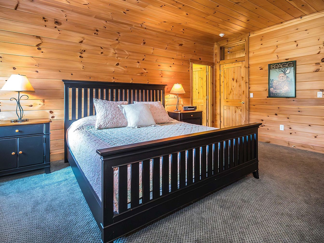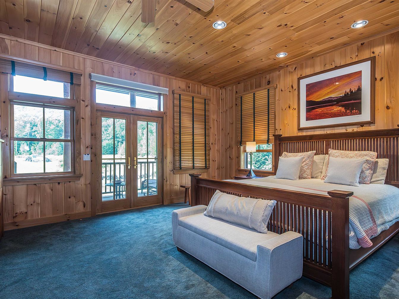 A spacious bedroom featuring warm wood-paneled walls and ceiling, creating a welcoming, cabin-like atmosphere ideal for families. A large, dark wooden bed sits at the center, dressed with soft, neutral-colored bedding and multiple plush pillows for comfort. Each side of the bed is flanked by matching dark wood nightstands, topped with elegant table lamps emitting a soft, ambient glow. The room features neutral carpeting that adds warmth and safety for children, while the natural wood tones of the doors and trim add rustic charm. A framed artwork adds a personal touch, making the space inviting and family-friendly.