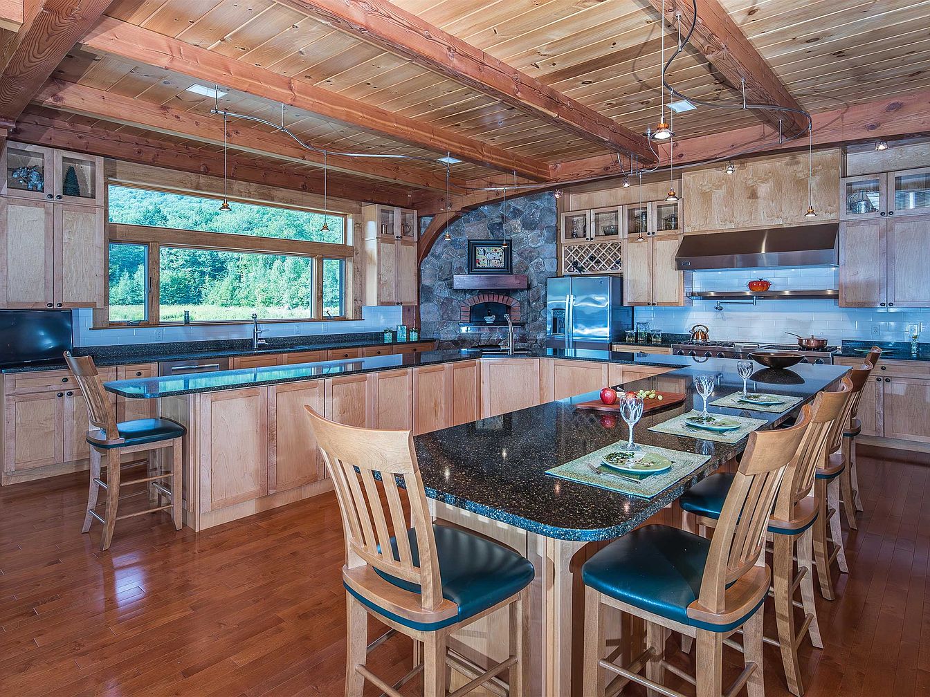 Spacious family-friendly kitchen featuring a large central island with a polished dark stone countertop and six wooden stools, each with a comfortable seat for casual dining. Warm natural wood dominates the cabinetry, ceiling, and exposed beams, creating a cozy and inviting atmosphere. The kitchen is designed with wide open spaces for easy movement, making it perfect for family gatherings or meal preparation with children. A large window floods the room with natural light and offers a view of lush greenery outside. Stainless steel appliances, a built-in stone oven, and ample storage prioritize both functionality and style in this inviting family hub.