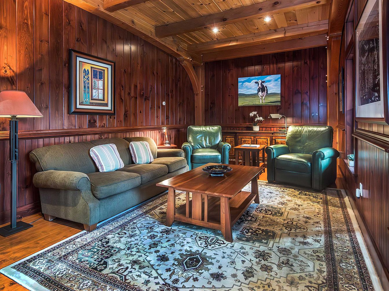 Warm wood-paneled walls and a beamed wooden ceiling create a welcoming, rustic ambiance in this living room, perfect for family gatherings. A plush olive-green couch and two matching leather armchairs offer generous, comfortable seating, surrounded by sturdy wooden side tables. The large area rug boasts a detailed geometric pattern in light cream and brown tones, enhancing the cozy feel and offering a soft play area for kids. Artwork, including a colorful farm-themed painting and framed prints, add personality. Gentle lighting from a floor lamp and built-in ceiling lights provides a soft, inviting glow, ideal for reading, relaxing, and enjoying time together.