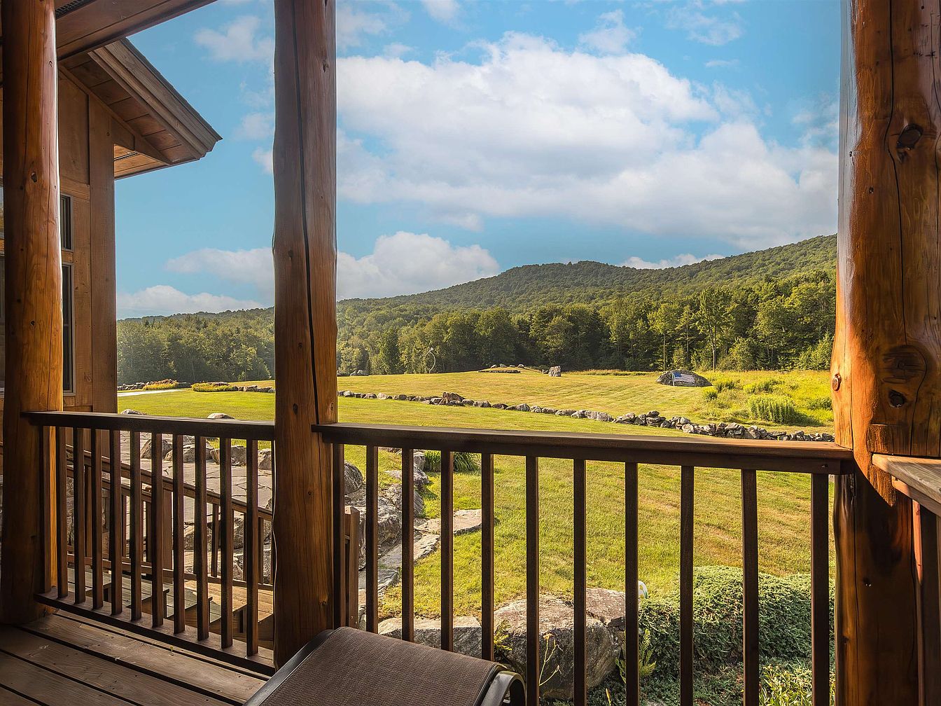 This welcoming covered porch features sturdy wooden beams, natural log railings, and a spacious wooden floor, offering a relaxing and secure environment for the whole family. The warm tones of the wood create a cozy atmosphere and complement the expansive view of lush green lawns and scenic rolling hills. Large stone accents and the structured layout of the yard provide ample outdoor space for children to play safely or for hosting family gatherings. The comfortable seating invites you to unwind while enjoying nature. Soft daylight and open vistas ensure a peaceful and inviting family retreat with a serene countryside ambiance.