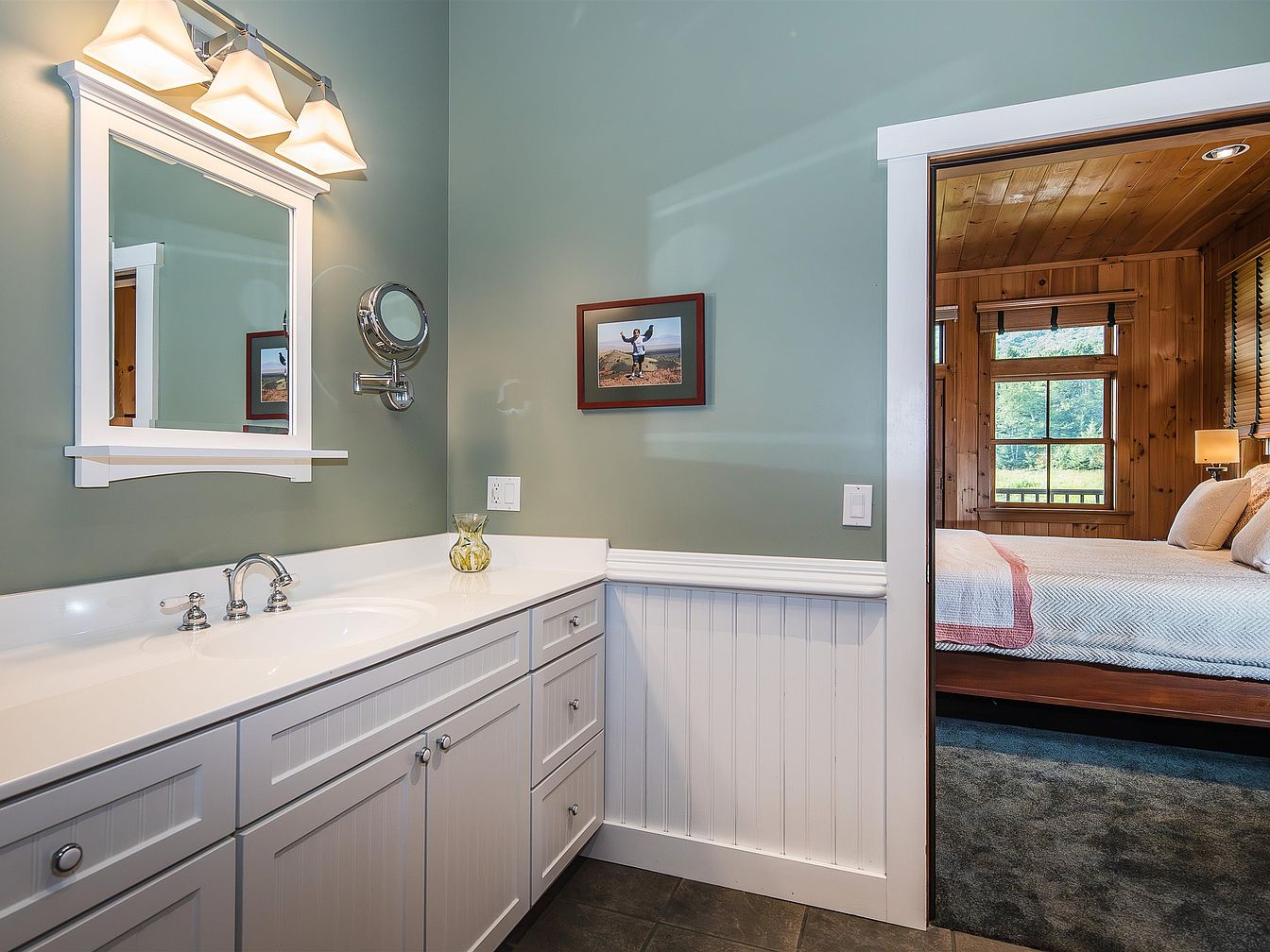 This inviting bathroom entry adjoins a cozy bedroom, making it ideal for family living with convenient access. The bathroom features a fresh, light green wall color with crisp white wainscoting and cabinetry, imparting a clean and calm atmosphere. The vanity area is equipped with ample counter space, a sleek under-mount sink, and modern brushed-nickel fixtures that complement the bright white countertop. Above the sink sits a large mirror framed in white, flanked by a trio of elegant light fixtures. Through a wide doorway, the bedroom’s natural wood paneling, large sunlit windows, and soft bedding foster a welcoming, restful environment for all ages.