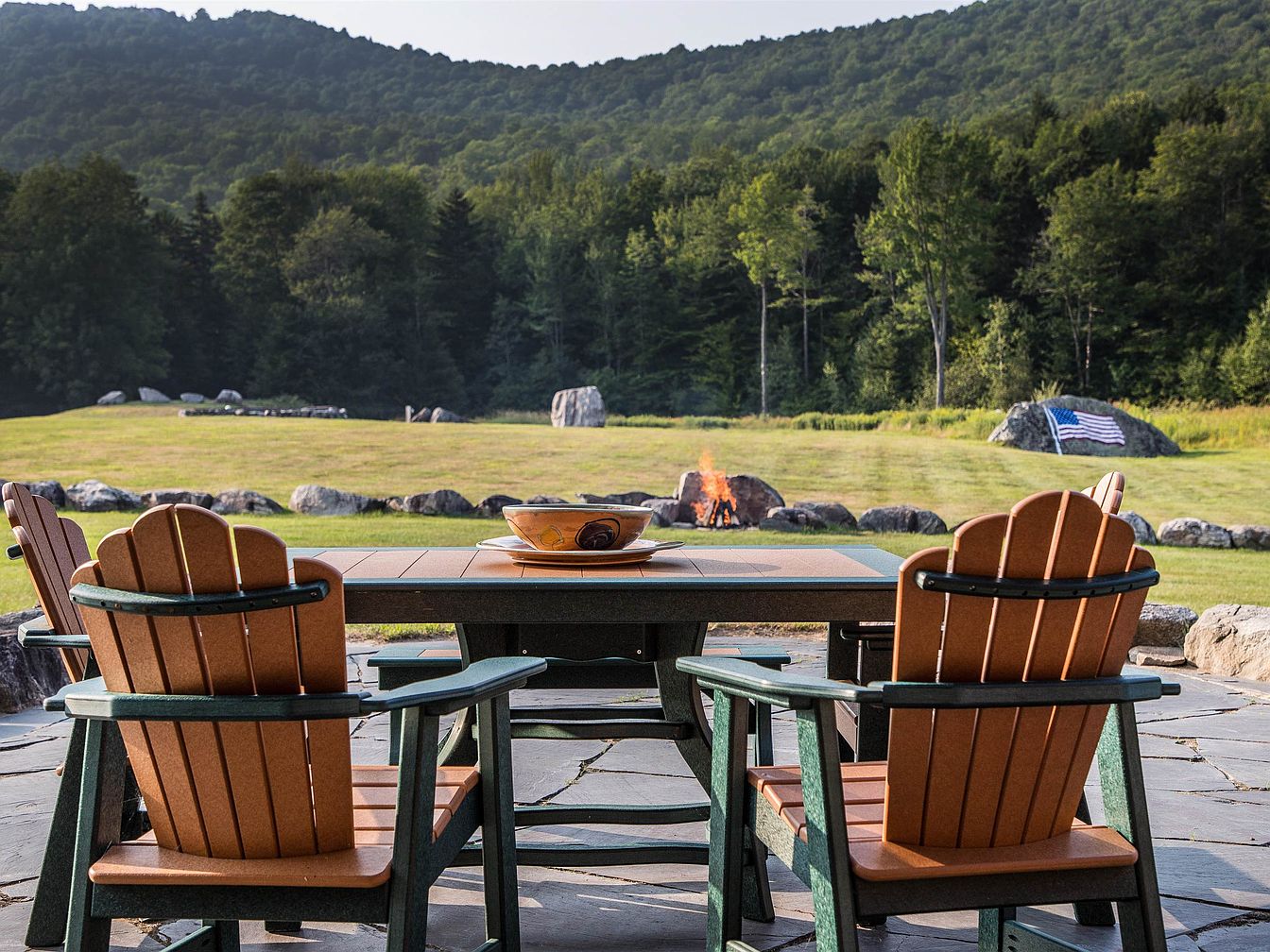 A spacious outdoor patio features sturdy, earth-toned Adirondack chairs arranged around a rectangular dining table, creating a welcoming space ideal for family gatherings or outdoor meals. The furniture is set on a stone paver floor, overlooking an expansive green lawn bordered by natural rocks and surrounded by lush, forested hills. A cozy fire pit sits in the distance, perfect for evening storytelling or roasting marshmallows with children. The serene setting is enhanced by the American flag resting on a large boulder, while the overall color scheme blends warm wood tones with forest greens and nature-inspired accents.