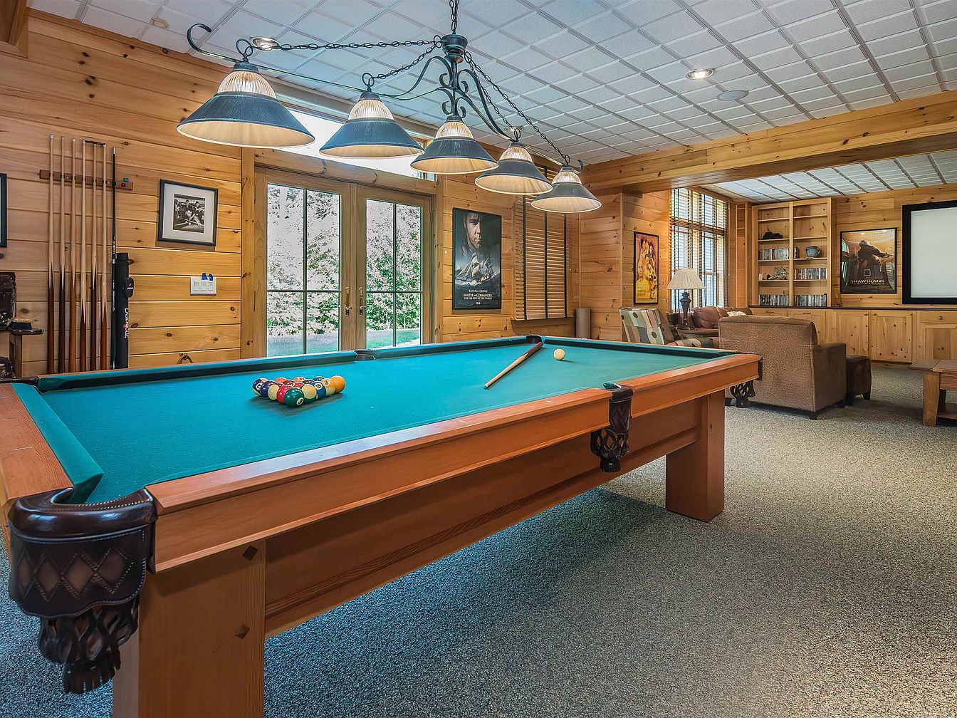 A spacious, inviting game room designed with warm wood-paneled walls and a soft, light gray carpet for a cozy, rustic feel. The centerpiece is a full-sized pool table topped with green felt, under a row of stylish hanging lamps. French doors bring in natural light, while framed art and classic movie posters add personality. Family-friendly features include an open layout perfect for gatherings, built-in shelving for games or books, and a comfortable sitting area with plush sofas and armchairs. The entire space blends functionality with leisure, making it ideal for both children and adults to relax or entertain together.
