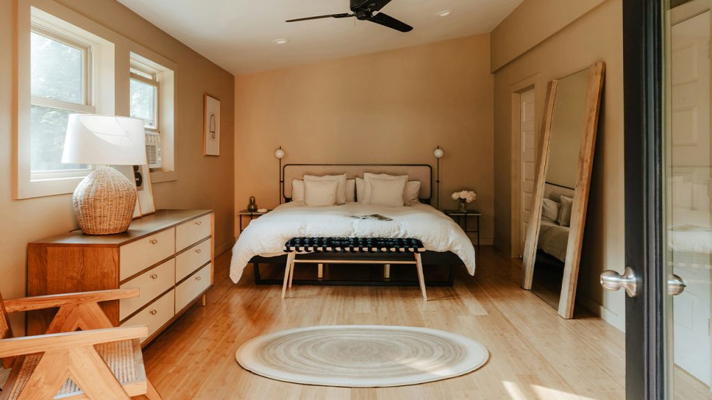 A single-color palette doesn’t have to be boring—play with textures to bring it to life. Pair matte cotton sheets with a velvet throw, or mix linen with soft knits. The monochrome look feels clean and cohesive, while the varied materials add layers of tactile richness that elevate the entire room without overwhelming the space.