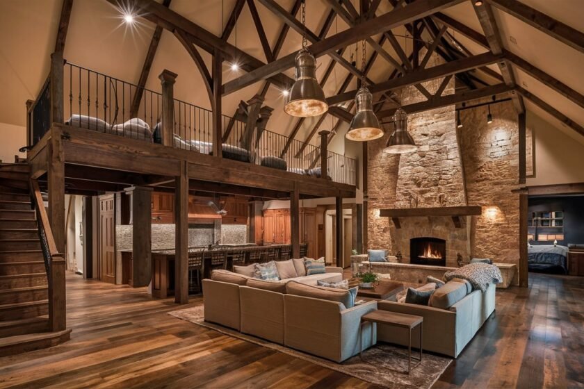 Often overlooked, the ceiling can be a unifying design element in an open floor plan. Wooden beams add rustic charm and create a sense of warmth. Painting the ceiling in a soft neutral shade or a subtle statement color can make the space feel more cohesive. Incorporating statement lighting—such as pendant lights over a dining table or a chandelier in the living area—helps visually define different zones while adding character. Thoughtful ceiling details make the space feel more structured and intentional.