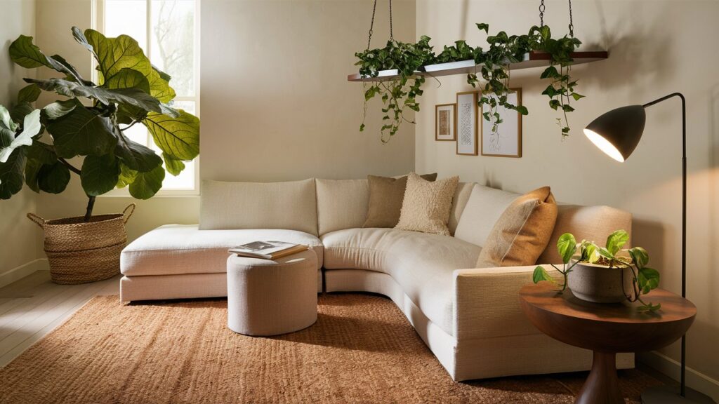 Transform an empty corner into a cozy, inviting space with a large statement plant. A fiddle leaf fig or rubber tree in a woven basket brings height and texture, making the room feel complete. Complement the arrangement with a sleek floor lamp and a cozy armchair to create a stylish reading nook. For added dimension, layer smaller plants like pothos or snake plants on nearby floating shelves or a side table. The mix of greenery enhances the living room’s vibrancy without overwhelming the space.