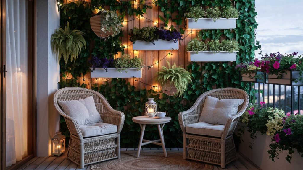 Maximize outdoor space by setting up a vertical garden with wall-mounted planters or a trellis. Trailing vines, flowering plants, and even edible greens can transform a small balcony into a lush retreat. Hanging planters or tiered shelves allow for a variety of greenery without taking up floor space. Pair the setup with cozy seating and soft outdoor lighting to create a serene, plant-filled oasis perfect for unwinding at the end of the day.