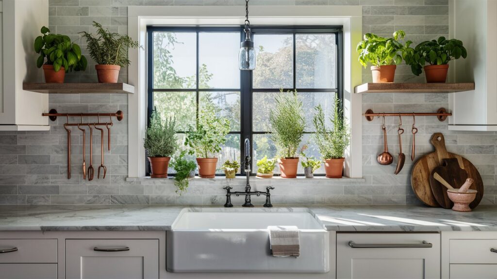 A kitchen windowsill or floating shelf lined with small potted herbs not only adds charm but also provides fresh ingredients for cooking. Basil, rosemary, and mint thrive in natural light and bring a pop of green to an otherwise functional space. Arrange the herbs in matching ceramic pots for a sleek look or mix in textured planters for a more rustic aesthetic. Hanging small planters from a rail system near the sink also maximizes space while keeping fresh flavors within reach.