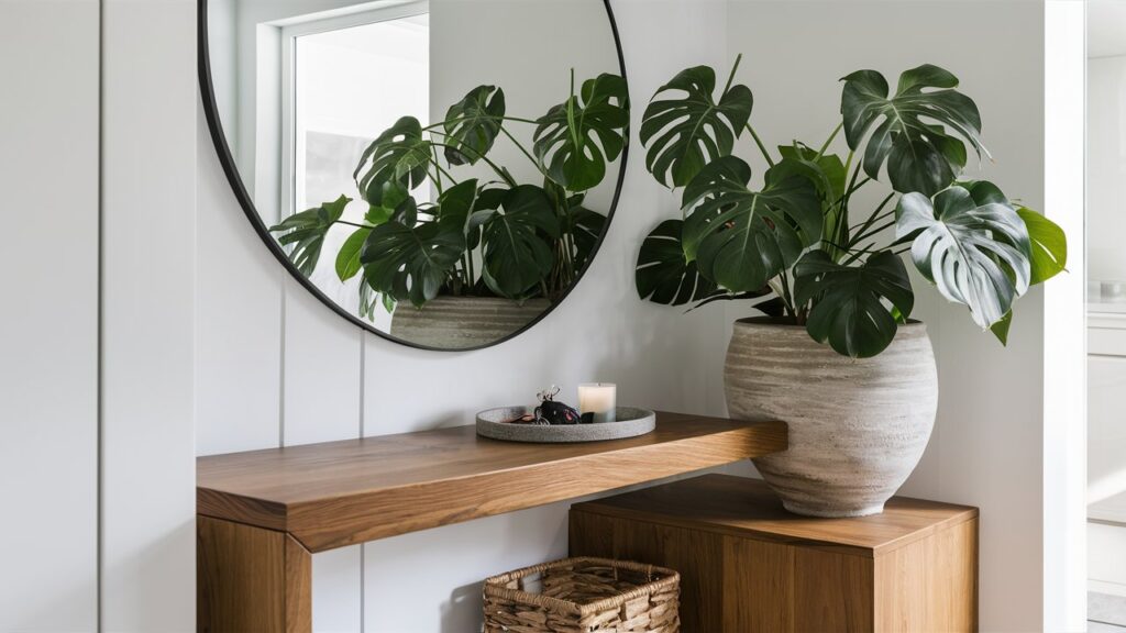 Make a striking first impression by styling your entryway with a bold plant like a monstera or rubber plant in a stylish planter. Placing it near a console table or bench helps frame the space, creating a polished look. A round mirror behind the plant can reflect light, making the entryway feel larger and brighter. Smaller potted plants or a vase with fresh flowers on the console table further enhance the welcoming feel without overcrowding the area.
