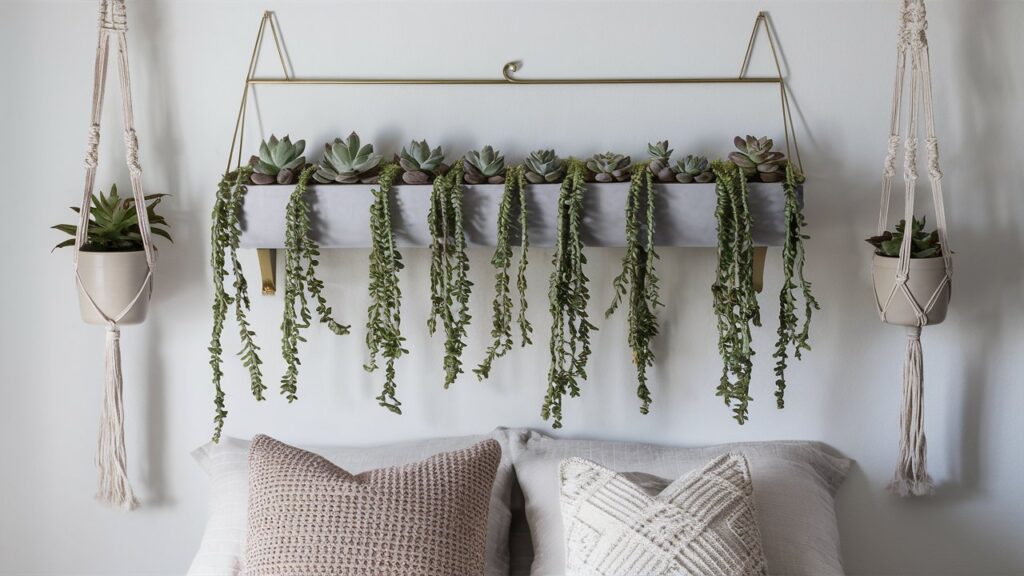 Create a calming atmosphere by styling a wooden shelf above your bed or nightstand with small, low-maintenance plants like peace lilies or succulents. A cascading pothos or trailing ivy adds softness, while a minimalist ceramic vase balances the display. Placing a snake plant on the floor near the bed not only enhances the look but also purifies the air, making your bedroom a tranquil retreat. Soft, neutral-toned planters help maintain a relaxed, cohesive aesthetic.