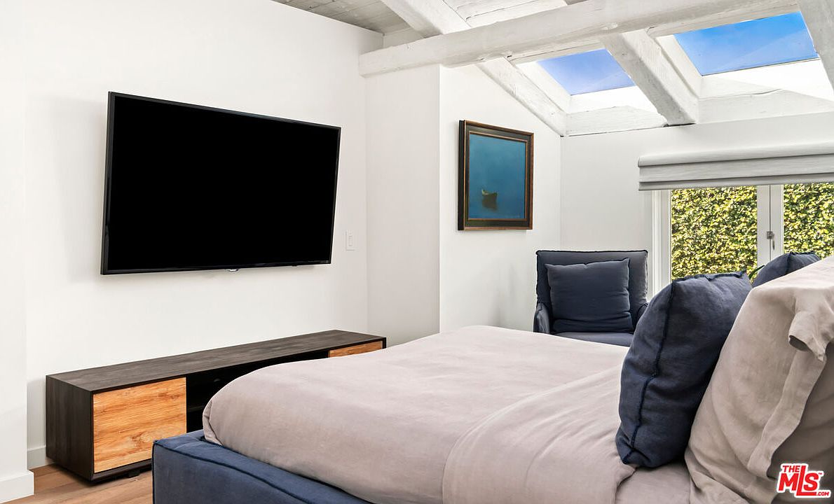 This bedroom corner highlights a modern yet cozy aesthetic with soft, neutral bedding complemented by deep blue pillows and a matching upholstered bed base. A sleek, low-profile media console features a dark wooden finish with lighter wood sliding panels, positioned beneath a large, wall-mounted flat-screen TV. Natural light floods the space through skylights set in exposed whitewashed ceiling beams, lending an airy and open feel. A comfortable blue armchair sits near a window framed by white walls and a minimal roller shade, offering a tranquil reading nook next to outdoor greenery visible outside. A subtle piece of framed artwork adds a touch of color and sophistication to the simple, clean-lined space.