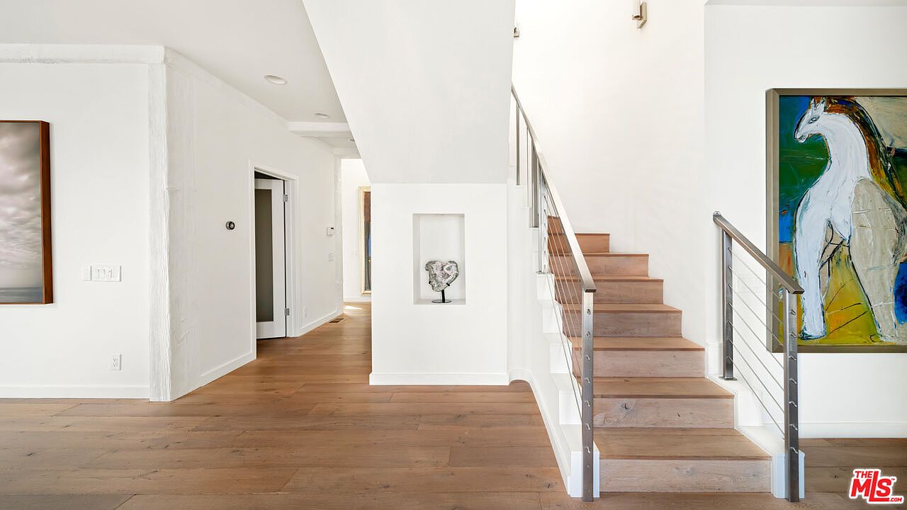 This spacious entryway features a modern staircase with light wood steps and sleek metal railings with cable infill, creating a clean and contemporary look. The walls are painted bright white, enhancing the natural light and giving the area an airy feel. The warm-tone wooden flooring extends throughout, adding an inviting coziness. A small alcove built into the wall under the staircase showcases an artistic stone sculpture, adding visual interest. On one wall, an abstract painting of a white horse introduces a pop of color and artistic flair, blending modern art with minimalist architecture.