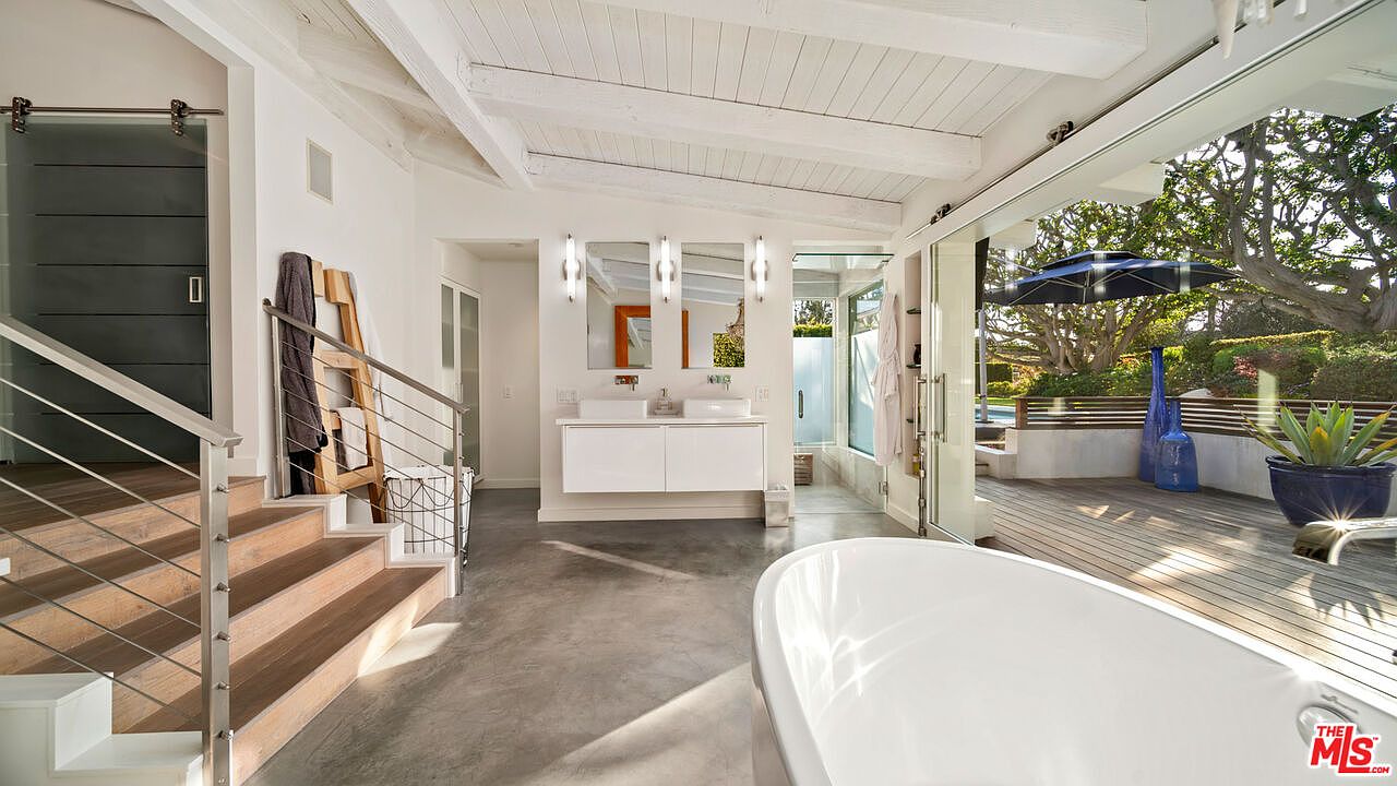 This bright and airy bathroom features a seamless connection to an outdoor patio through large glass folding doors, inviting natural light and garden views inside. The space showcases minimalist design with polished concrete floors and a white-painted wooden beam ceiling. A floating double vanity with vessel sinks is set against a white wall, illuminated by sleek vertical wall sconces. Light wood stairs with a modern metal railing lead into the room, adding warmth to the neutral palette. The freestanding bathtub positioned near the glass doors offers a tranquil spot to relax while enjoying the outdoor landscape ambiance.