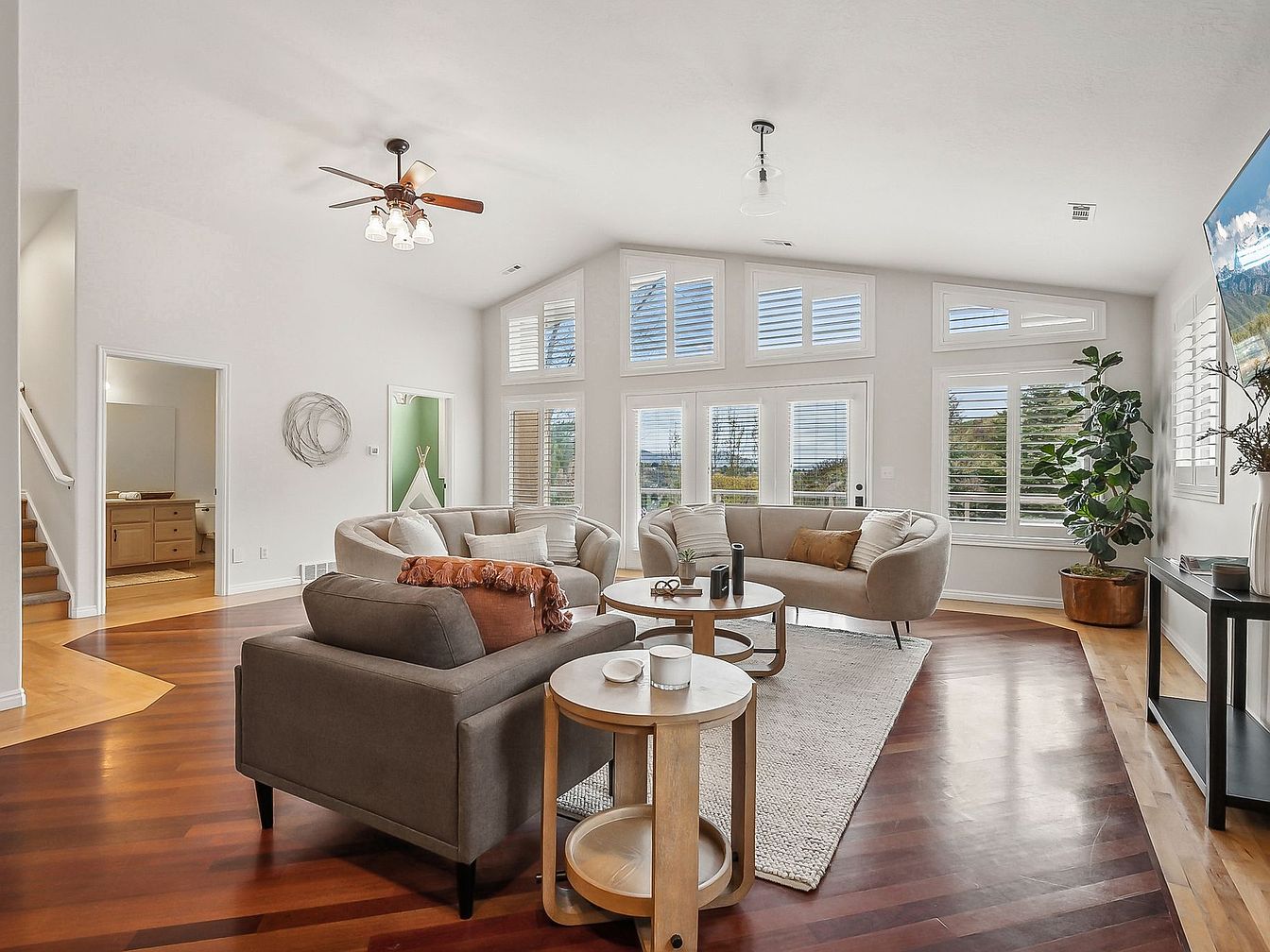 This living room corner features a vaulted ceiling that enhances the spacious feel, with modern ceiling lights including a fan fixture. The floor is a rich, warm hardwood with a geometric border pattern that elegantly frames the seating area. A pair of curved beige loveseats with soft cushions and a dark gray armchair surround two circular wooden coffee tables on a textured, neutral rug. Floor-to-ceiling windows with plantation shutters flood the space with natural light, highlighting a large potted plant and a mounted flat-screen TV, blending contemporary comfort and style.