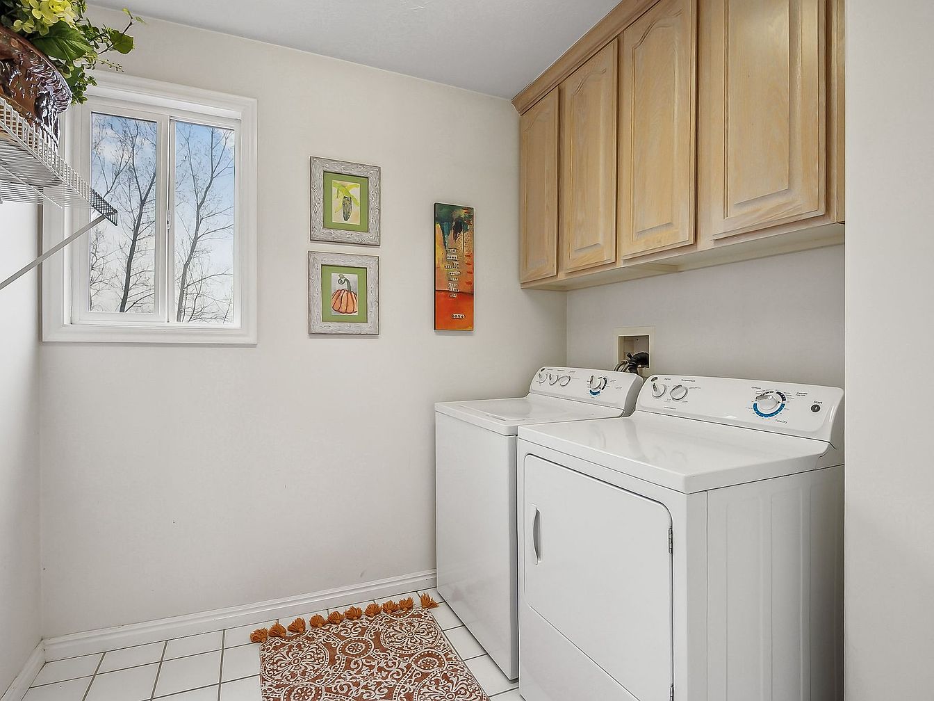 This laundry room features a clean, functional layout with a white washing machine and dryer placed side-by-side beneath a row of light wood cabinetry, providing ample storage space. The walls are painted a soft, neutral shade, creating a bright and airy atmosphere complemented by natural light streaming in through a window that overlooks bare trees outside. Decorative elements include two framed botanical prints and a narrow colorful artwork, adding a touch of personality. A patterned rug with warm hues lies on the off-white tiled floor, enhancing the cozy yet practical feel of the space.