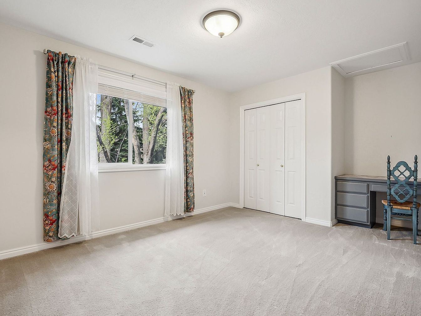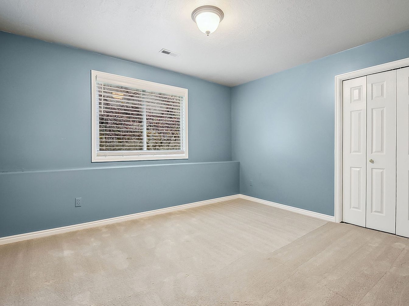 This bedroom features soft blue walls that create a calming ambiance. A large window with white horizontal blinds allows natural light to brighten the space while maintaining privacy. The white trim around the window, baseboards, and closet doors contrasts elegantly with the wall color. The beige carpet adds warmth and comfort underfoot, complementing the cool wall shade. A simple ceiling light fixture in the center provides general illumination. The double-door closet offers ample storage, seamlessly integrated into the room. Clean lines and neutral tones give this bedroom a fresh, inviting appearance suitable for relaxation or personalization.