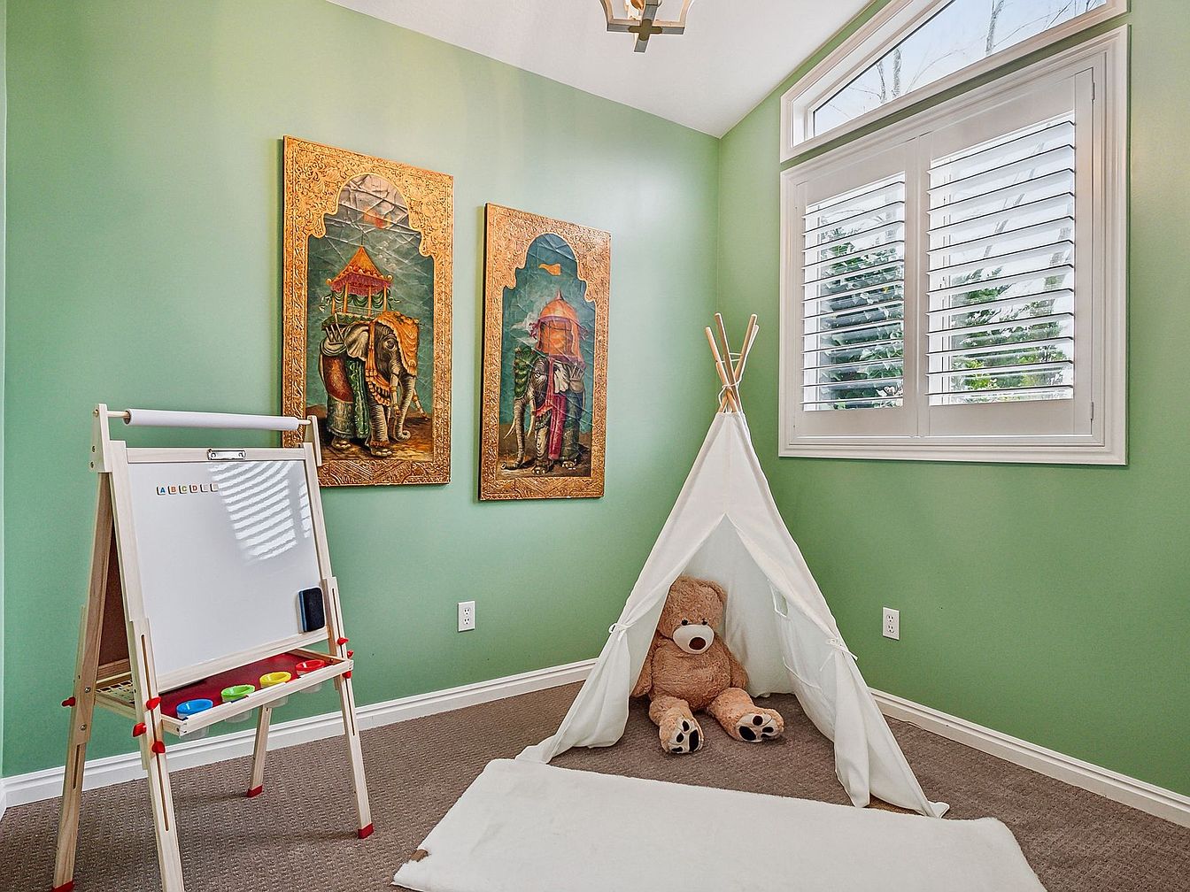 This cozy children’s playroom features soft green walls creating a calming and inviting atmosphere. A whiteboard easel with alphabet magnets and colorful paint pots encourages creativity and learning. Against one wall, two ornate, framed artworks with rich gold and deep colors add an elegant touch, contrasting with the playful setting. A small white teepee tent, perfect for imaginative play, houses a large, plush teddy bear, making the room feel warm and comforting. The window has white plantation shutters allowing natural light in while maintaining privacy. Neutral brown carpeting adds warmth and comfort underfoot.