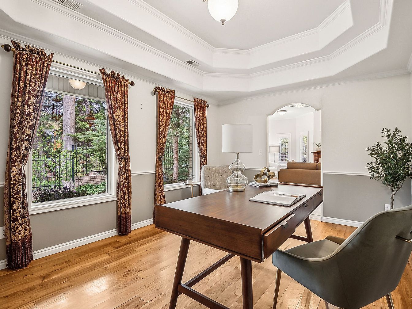This home office features warm hardwood floors complementing a sleek mid-century modern wooden desk with clean lines and functional drawers. A soft green upholstered chair adds comfort, balancing well with the neutral tones of the lowered wall paint and crisp white upper walls. Three large windows dressed in deep red and gold patterned curtains allow natural light to brighten the space while offering a view of lush greenery outside. Architectural interests like the coffered ceiling and an arched doorway leading to adjacent rooms add elegance to this inviting, practical workspace.